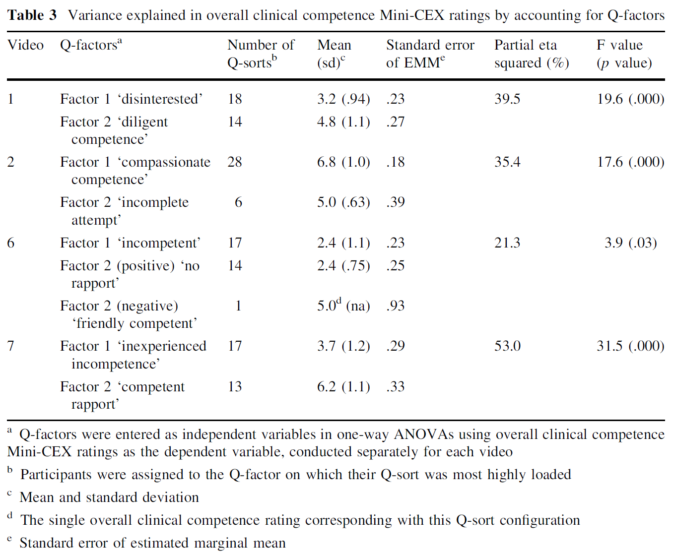 서로 다른 관점이 의사가 할당한 등급과 관련이 있는지 확인하기 위해, 참가자들은 Q-정렬이 가장 높은 상관 관계를 갖는 Q-요인에 할당되었고, Q-요인 할당을 일원 분산 분석에서 독립 변수로 사용하여 설명할 수 있는 분산 비율을 결정했습니다(부분 에타 제곱) '전체 임상 역량' Mini-CEX 등급에 포함됩니다.