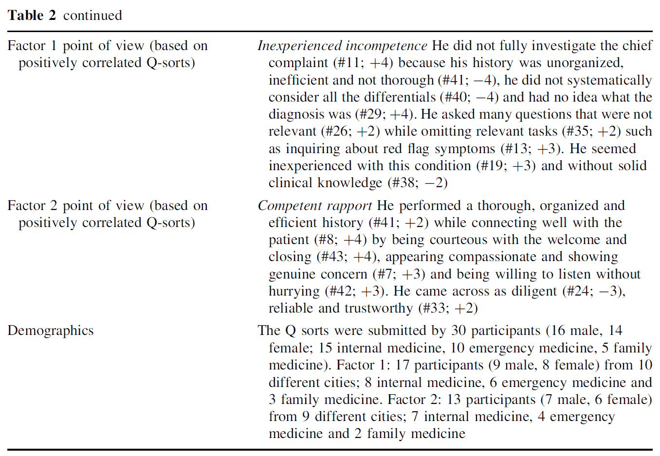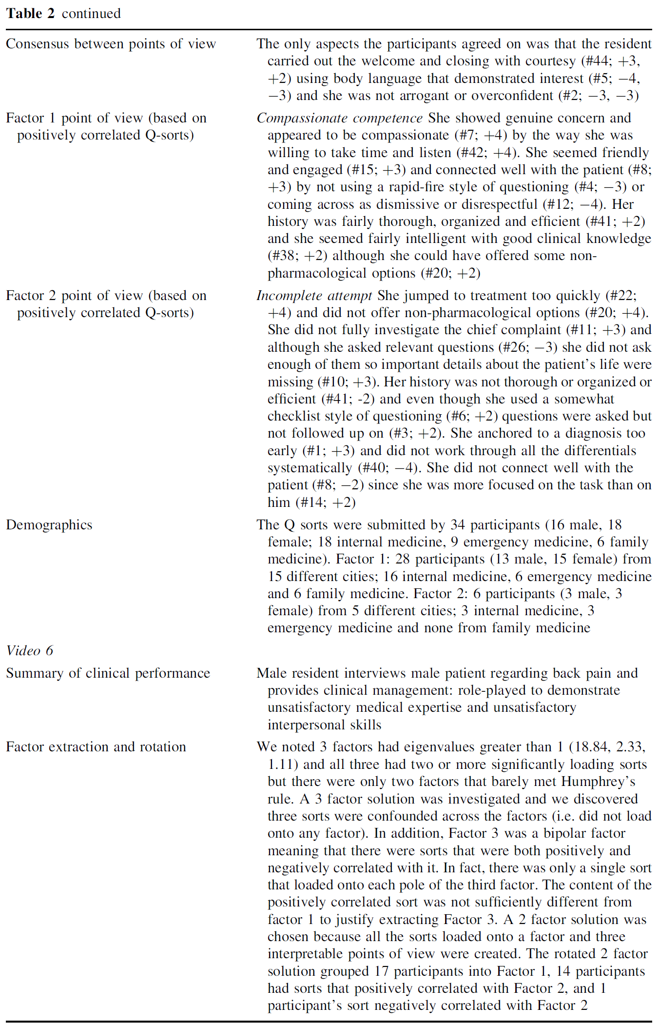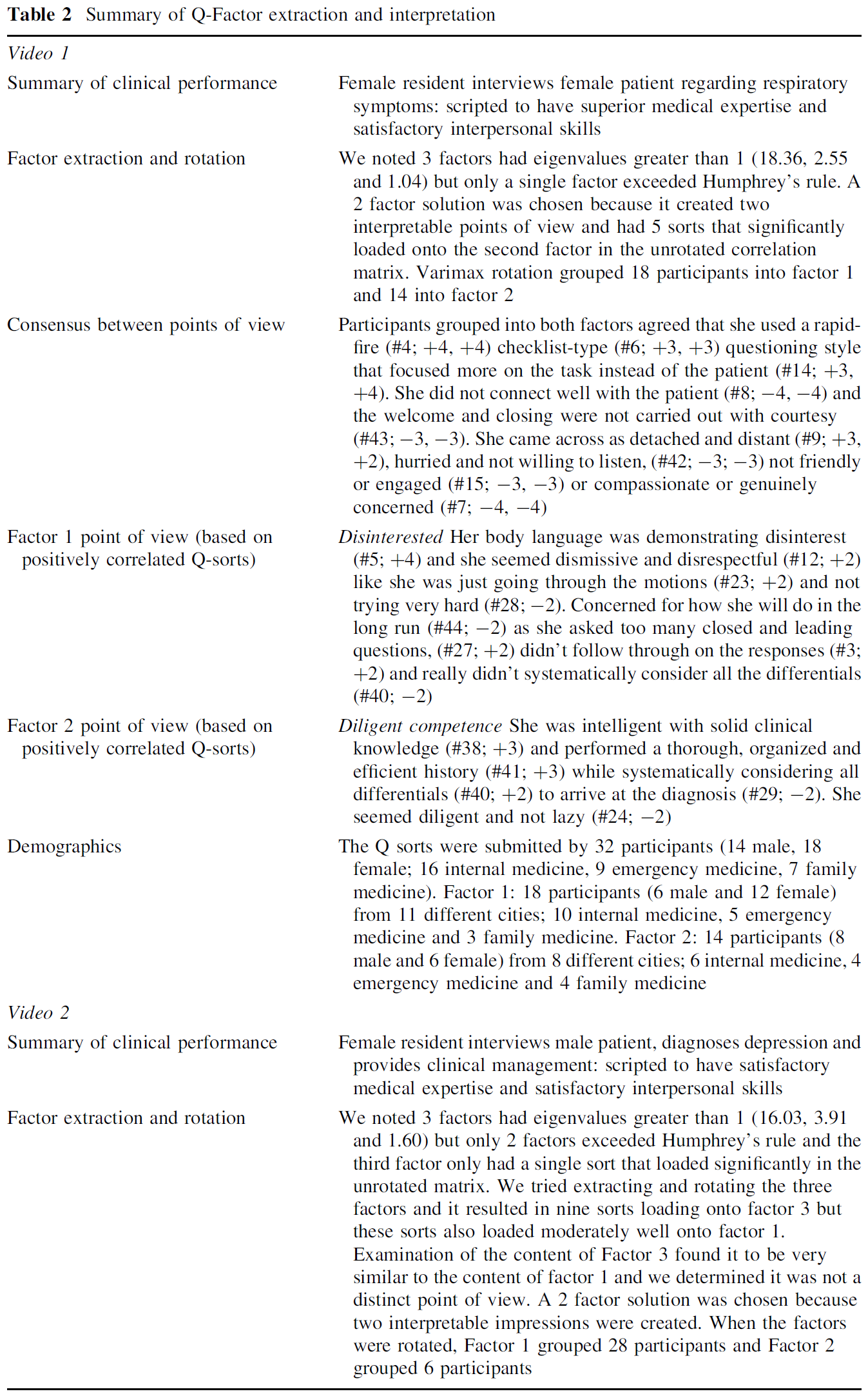 If all participants had shared a single point of view on the clinical performance, we would expect them to sort the statements in a similar configuration and a single Q-factor to be identified. This did not occur. Instead, a 2-factor solution was determined to be the best fit for each of the four videos (see Table 2 for details regarding factor extraction and rotation). In other words, based on subsets of similar Q-sorts the analysis revealed two major clusters of consensus among participants’ impressions for each of the clinical performances.