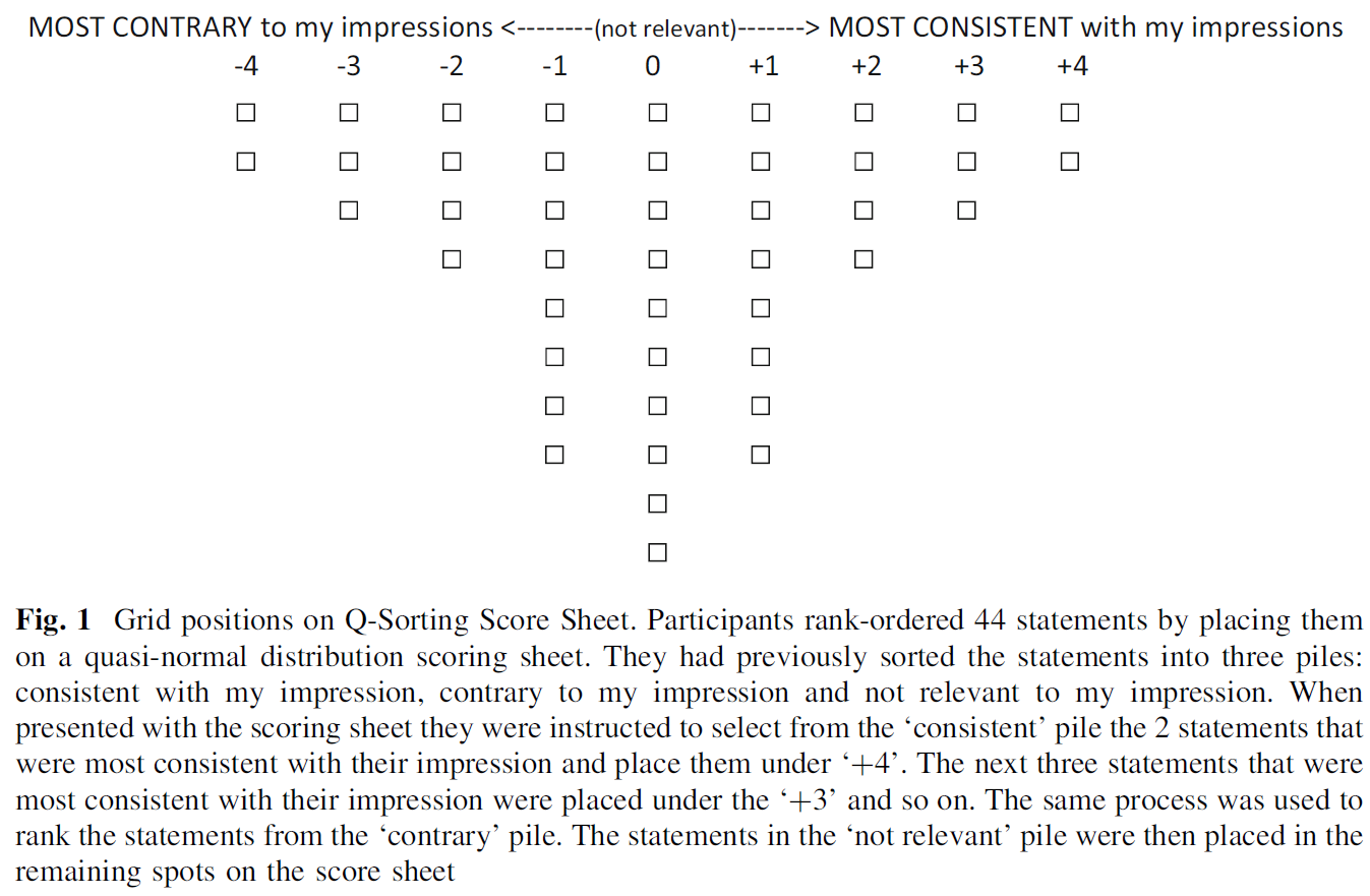 FlashQ 소프트웨어는 Q-sort를 용이하게 하기 위해 사용되었으며, Q-sort 작업에 권장되는 여러 단계(자세한 내용은 그림 1 참조)로 완료되었습니다(Newman 및 Ramlo 2010, Watts 및 Stenner 2012). Q-Sort를 완료한 후, 참가자들은 다음을 설명하기를 요청받았다.