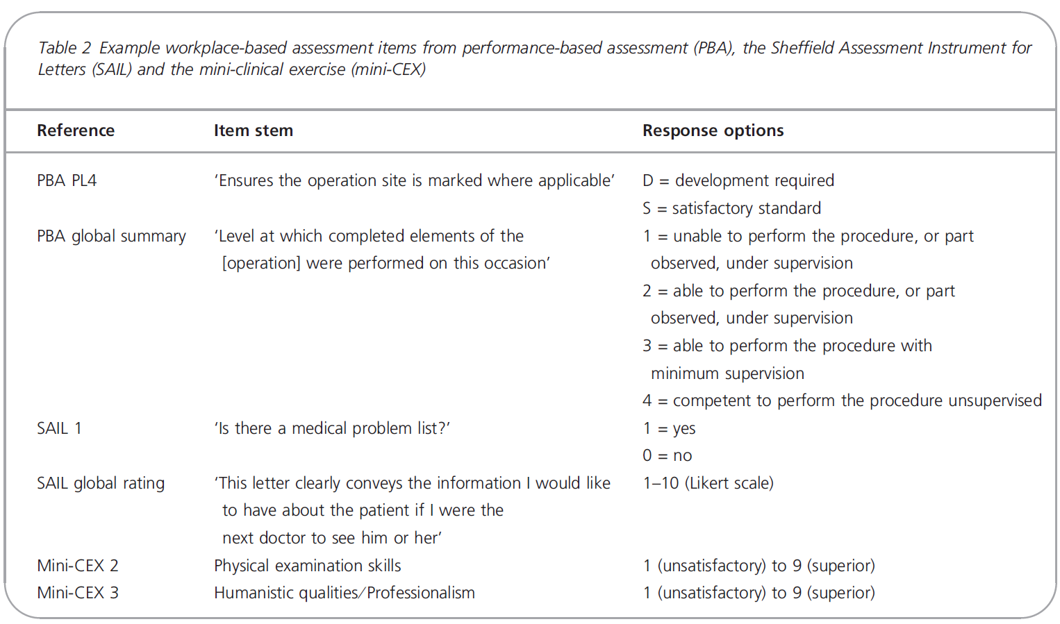 서로 다른 WBA 평가도구들이 서로 다른 개념적 출발점의 성능에 대해 묻습니다. 표 2는 세 가지 도구의 두 가지 예(항목 줄기 및 대응 옵션)를 제공한다. 즉, 수술 능력 평가를 위한 PBA 기구 14, 임상 의뢰 대응 평가(SAIL) 25, 임상 만남 평가를 위한 mini-CEX4이다.