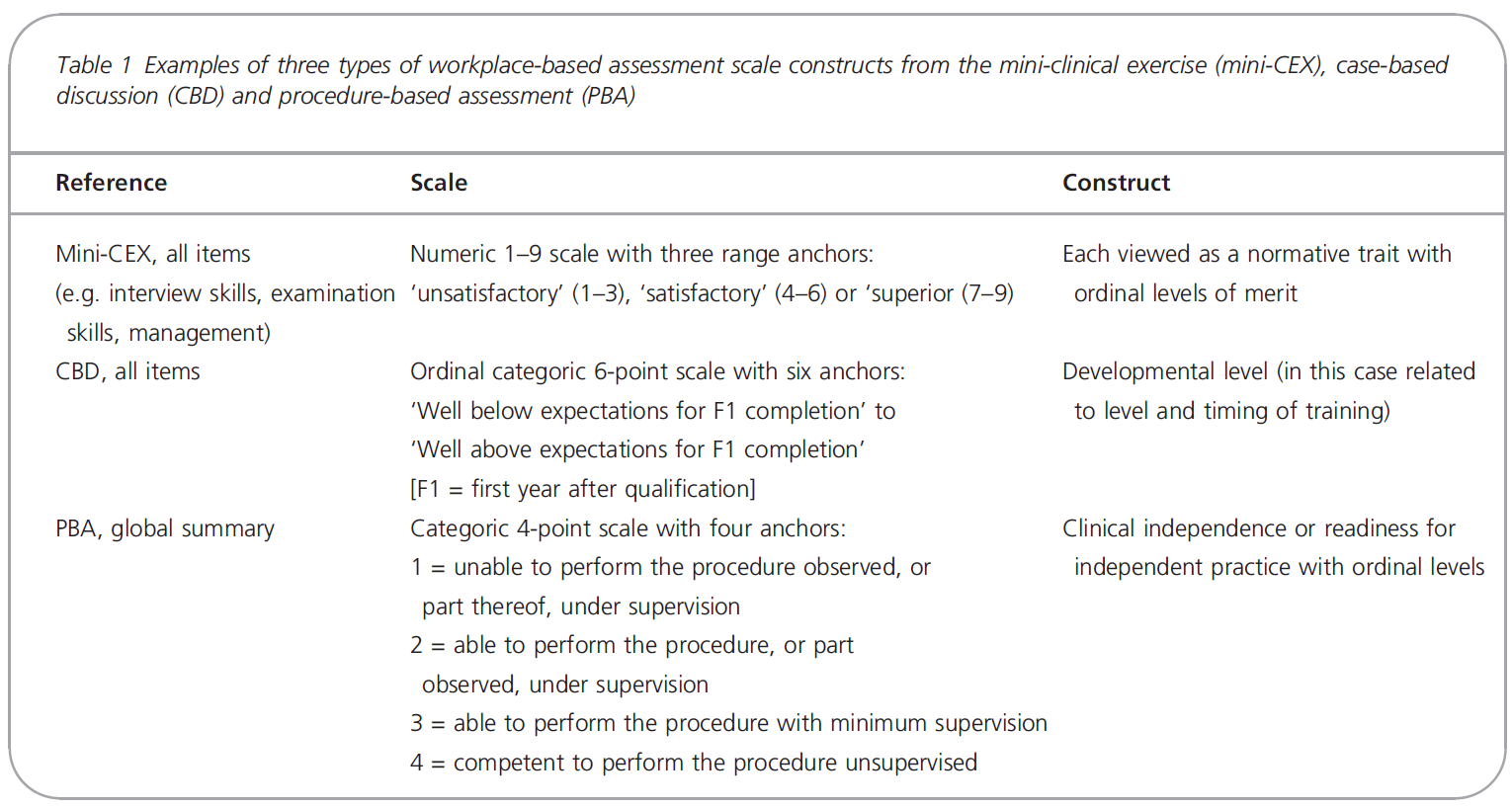 Table 1 provides some examples of the use of such scales from the mini-CEX,4 case-based discussion (CBD)13 and procedure-based assessment (PBA)14 instruments. Response scales align themselves to one of a variety of constructs, including: