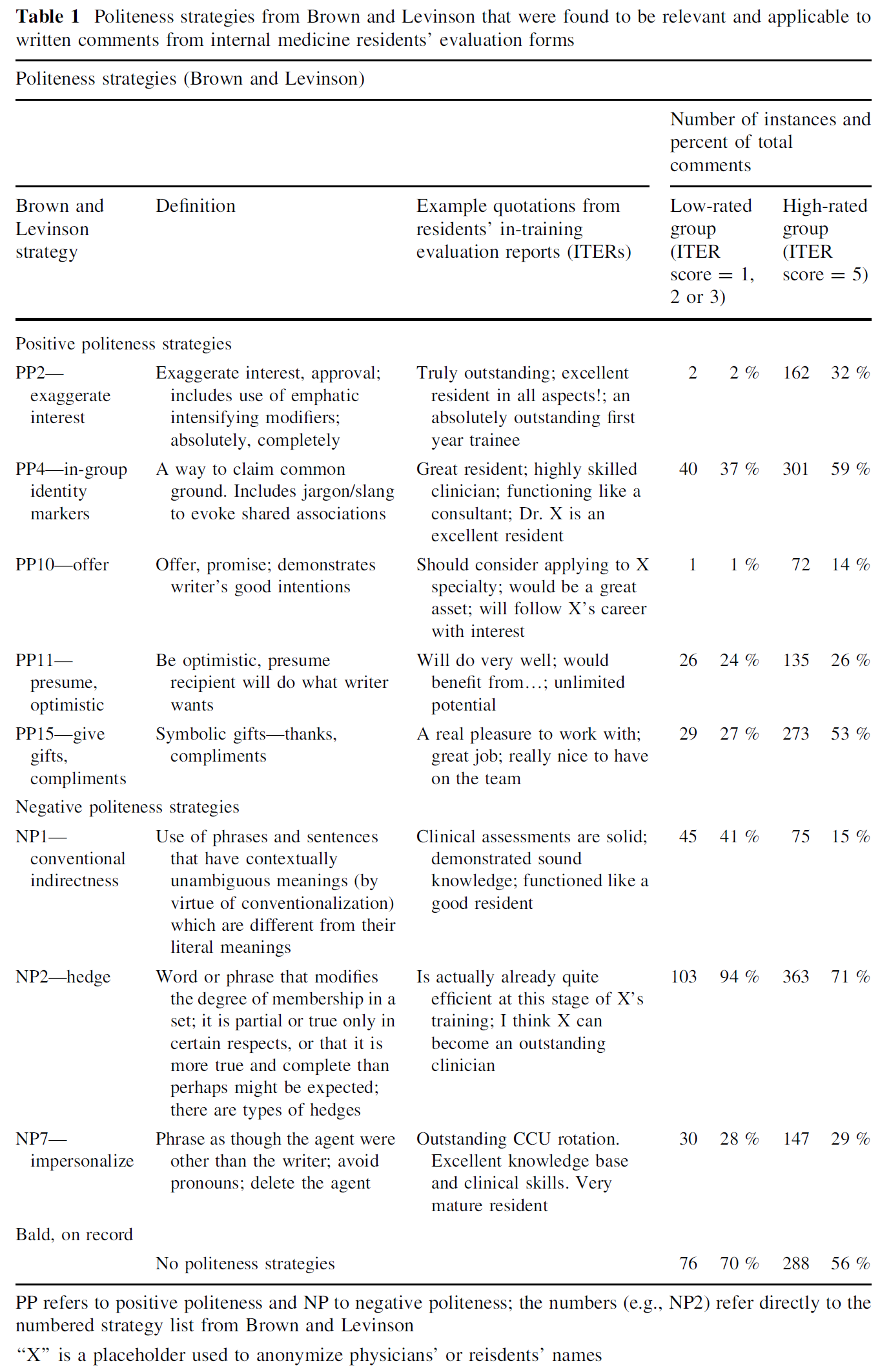 두 번째 전략은 "그룹 내 정체성 표식기"를 저자와 수령자(전공의) 사이의 공통점을 주장하는 방법으로 사용하는 것이다(브라운과 레빈슨 1987, 페이지 107). 레지던트, 수련생, 임상의, 컨설턴트 또는 의사, 또는 존댓말 '닥터'가 포함된 문구가 여기에 포함되었다. 비록 우리 데이터의 맥락(전공의 평가)에 따라 그룹 내 표지를 예상할 수 있지만, 이 용어들은 낮은 등급(59 대 37%; v2 = 17, p\0.001)과 비교하여 높은 등급 그룹에서 더 자주 사용되었음을 주목하는 것이 흥미롭다.