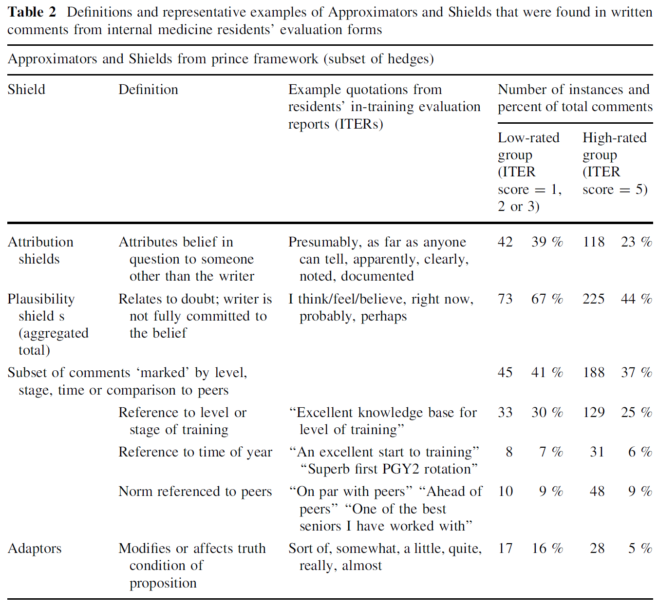 The phrase ‘‘Although I only interacted with himfor about 2 weeks’’ also offers a first look at the most common linguistic strategy we found in our data: Hedging, which was pervasive in our data, being present in 94 % of comments from low-performing residents and in 71 % of comments from high-performing residents (v2 = 27, p\0.001). Some examples of general hedging include phrases such as ‘‘could have been a little more rapid in starting the clinic/picking up charts to get going’’ or ‘‘works well, fairly independently’’. The words ‘‘could have’’, ‘‘a little more’’, and ‘‘fairly’’ are hedges because they affect either the ‘truth condition’ of the statement or the writer’s commitment to the assertions made—in the first instance the attending could instead have written ‘‘should have been more rapid in starting the clinic’’ which would leave no room for doubt. Most hedges were further classifiable as either Attribution or Plausibility Shields. Table 2 contains further definitions and examples of subtypes of hedging including Approximators and Shields.