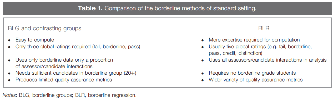 With the requirement for standards to be defensible, evidenced and acceptable (Norcini 2003), absolute standards are generally used. Whilst all methods of standard setting will generate a number of post hoc metrics (e.g. station pass rates, fixed effects (time of assessment and comparison across sites)or frequency of mark distribution), it is important to choose a method of standard setting that generates additional quality measures. At present, a large number of institutions favour borderline, but only the regression method will give someindication of the relationship between global grade and checklist score and also the level of discrimination between weaker and stronger students.