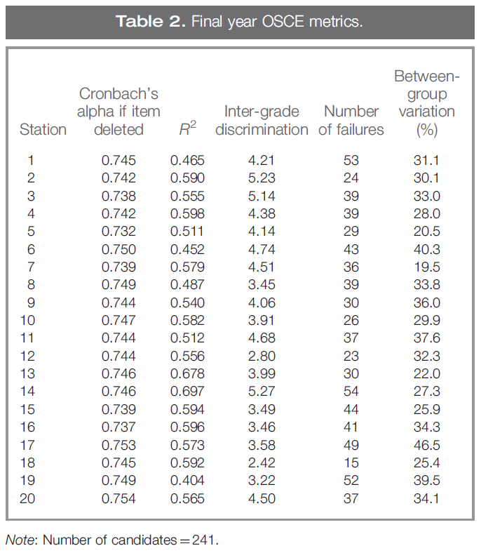 표 2는 일반적인 OSCE의 측정 지표에 대한 '표준' 보고서를 자세히 설명합니다(2일 동안 20개 스테이션, 총 시험 시간 3시간, 4개 검사 센터에 분산).