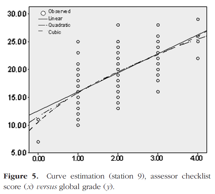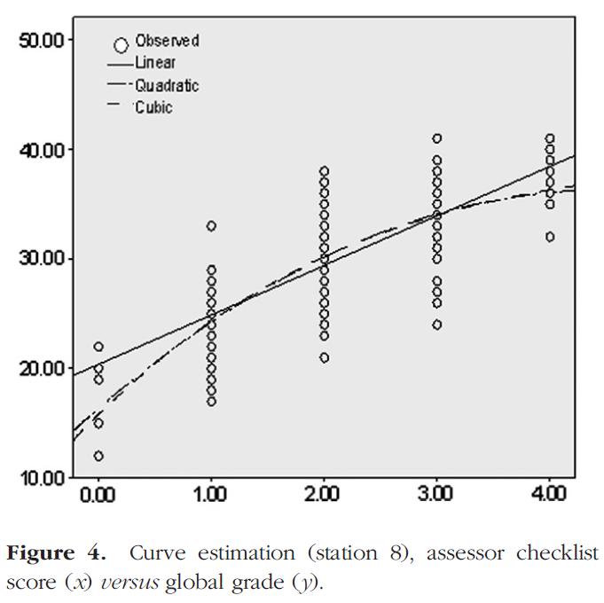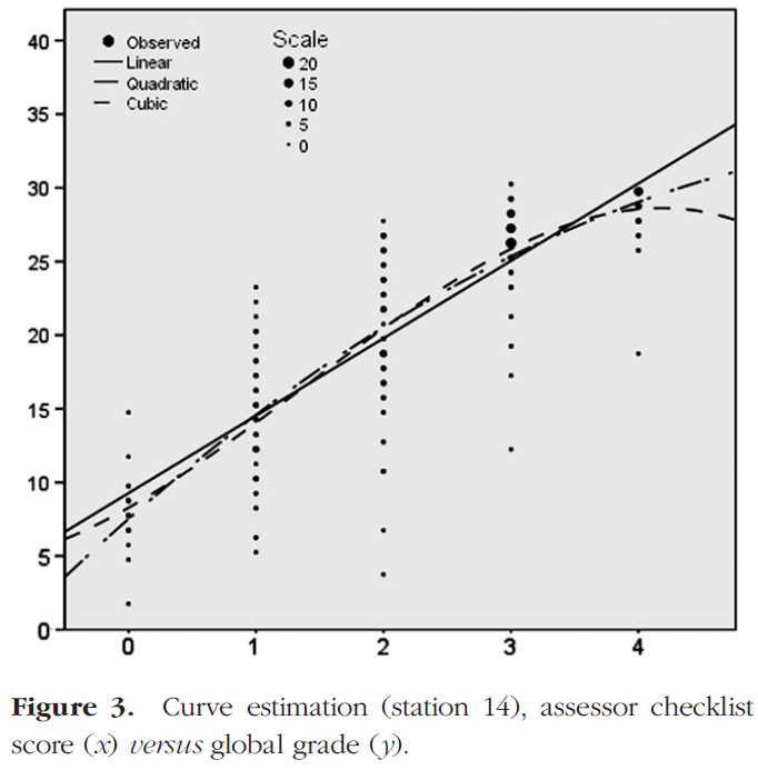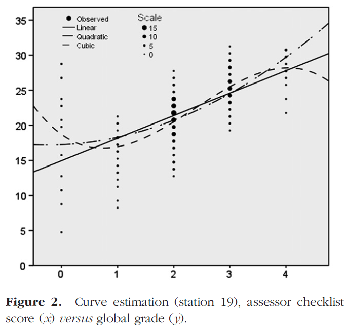 중요한 점은 cubic이 기본적인 관계의 결과인지, 아니면 비정상적인 결과인지 여부이며, 이 결과가 부적절한 체크리스트 설계 또는 허용할 수 없는 평가자 채점 행동으로 인한 결과인지 여부이다. 이러한 판단을 할 때, 산란도scattergraph에 표시된 표시의 분포를 검토해야 한다. 우리 자신의 경험에 따르면 스테이션 지표가 일반적으로 품질이 양호한 경우 엄격한 선형성으로부터의 이탈은 우려의 원인이 되지 않습니다.