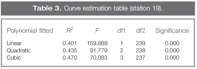 스테이션 9는 아래 그림 5의 곡선 추정으로 표시됩니다. 여기서는 신뢰성에 대한 보다 긍정적인 기여(항목 삭제 시 알파 0.74)와 더 나은 스테이션 수준 메트릭을 확인할 수 있습니다. R2 계수는 0.5에서 허용되지만 군간 분산은 36%로 여전히 높습니다.