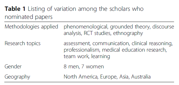 Methods: Fifteen purposefully selected researchers in medical education were asked to nominate papers they considered influential in medical education. Through this process 41 papers were identified and included in the study.