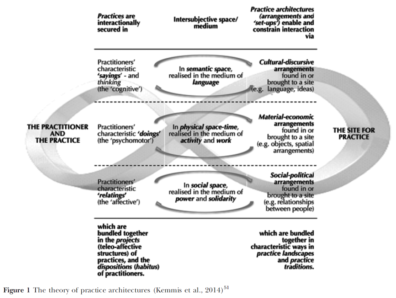 Kemmis 등은 사회적 세계에서의 관행practice이 의미 공간, 물리적 공간, 사회적 공간에서 형성된 '상호 주관성의 3차원'에 함께 존재한다고 제안합니다. 이러한 주관적 공간들은 '말하기', '하기', '관계'를 통해 교육이 이루어질 수 있는 공간을 형성한다. 실무에서 이러한 '함께 어울림'이라는 개념은 실무가 그 자체로 이러한 행동들 중 하나로 축소될 수 없다는 것을 의미하기 때문에 중요하다.