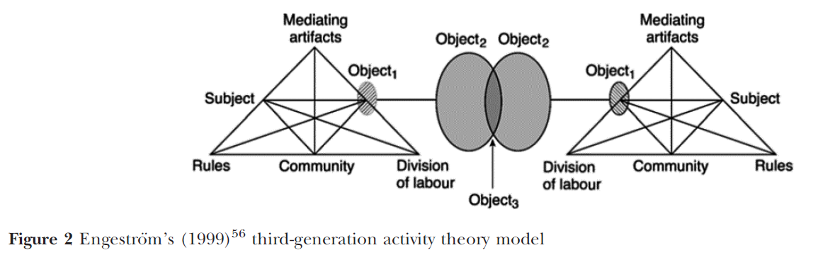 Engestroom의 원래 프레임워크는 이후 수년간의 확장을 거쳐서(3세대 AT; 그림 2 참조) 여러 상호작용 활동 시스템의 네트워크를 통합하였으며, 서로 다른 시스템이 중복된다는 것을 인정하게 되었다.