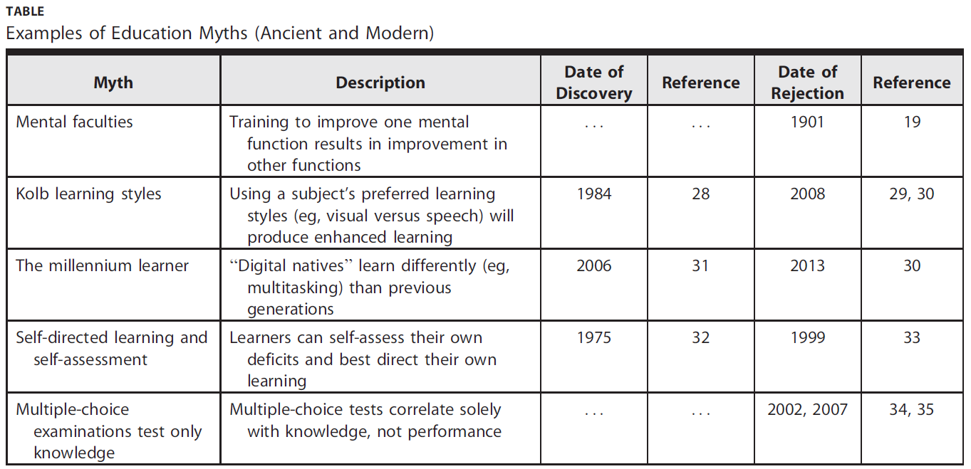 As Roediger1 points out, many of these myths have remarkable longevity. Some myths have not only been around for more than 100 years, but also were disproved more than 100 years ago (see TABLE).