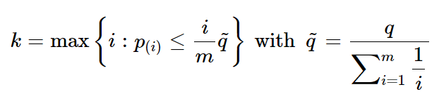 Similar to BH method, a more conservative adjustment was further proposed for controlling FDR by Benjamini and Yekutieli [2001], and this method is also termed BY adjustment (11). Let again q be the pre-specified upper bound of FDR, the index k is computed as:
