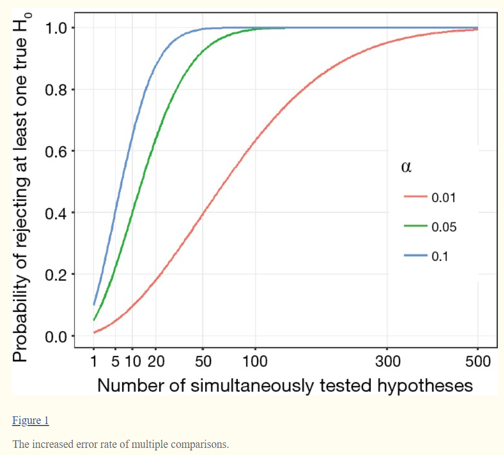 하지만 우리가 비교하고자 하는 다양한 비교가 서로 독립적이지 않다면 어떨까요? 아니면 우리가 25와 같이 많은 수의 비교를 한다면 어떨까요? 독립 변수 및 종속 변수가 상관관계가 있는 경우와 수많은 검정이 수행되는 상황에 대한 방법이 있습니다. 이 소개 기사의 범위를 벗어나, 독자들이 다중 비교와 방법을 지원할 수 있는 다양한 접근 방식에 대해 자세히 알아볼 수 있는 좋은 자료가 많이 있습니다(자료 참조).