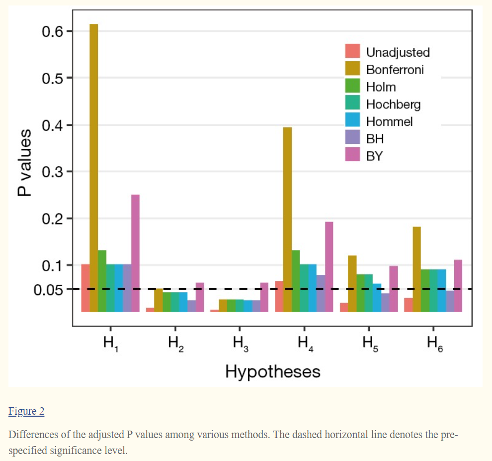 Equivalently, we could let the observed P values unchanging and directly adjust the significance level as α′ = α/m = 0.05/6. For our illustrative example the adjusted P values are compared with the pre-specified significance level α=0.05, and the statistical conclusion is obviously altered before and after adjustment (Figure 2). Bonferroni adjustment has been well acknowledged to be much conservative especially when there are a large number of hypotheses being simultaneously tested and/or hypotheses are highly correlated.