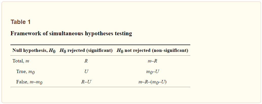 The statistical inference would be a critical step of experimental researches, such as in medicine, molecular biology, bioinformatics, agricultural science, etc. It is well acceptable that an appropriate significance level α, such as 0.05 or 0.01, is pre-specified to guarantee the probability of incorrectly rejecting a single test of null hypothesis (H0) no larger than α. However, there are many situations where more than one or even a large number of hypotheses are simultaneously tested, which is referred to as multiple comparisons (1). For example, it is common in clinical trials to simultaneously compare the therapeutic effects of more than one dose levels of a new drug in comparison with standard treatment. A similar problem is to evaluate whether there is difference between treatment and control groups according to multiple outcome measurements. Due to rapid advances of high-throughput sequencing technologies, it is also common to simultaneously determine differential expression among tens of thousands of genes.