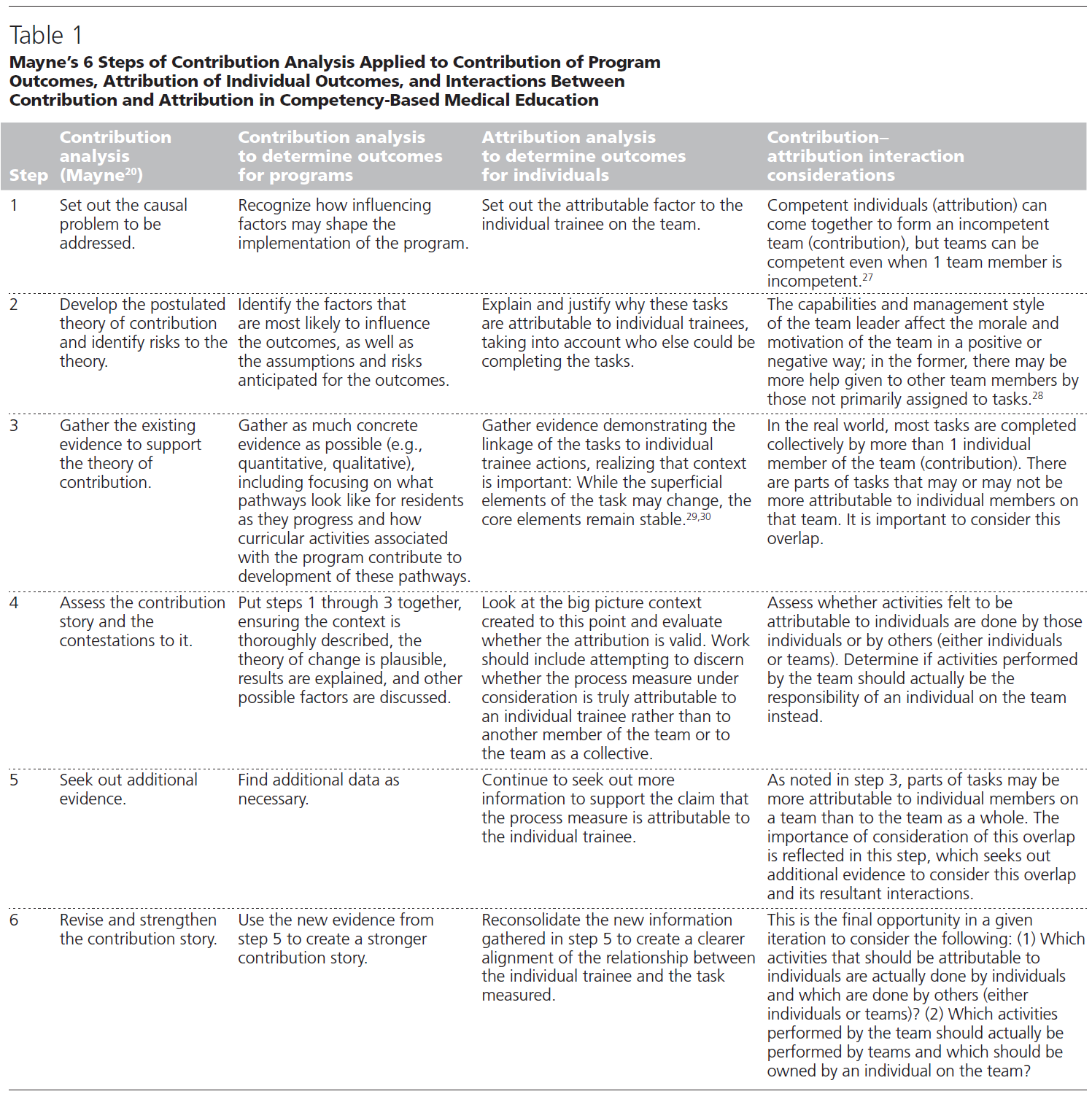 As detailed in the next section, Table 1 further delineates how these steps can be applied to determining the contribution of program outcomes, the attribution of individual outcomes, and the interactions between contribution and attribution in CBME.