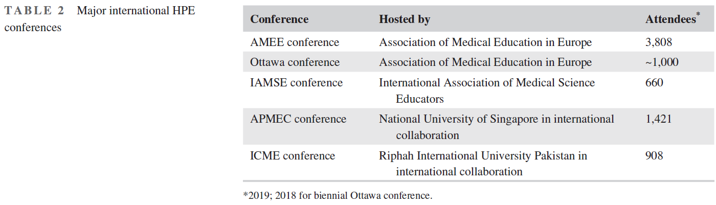 회원들과 회의 참석자들에 의해 가장 큰 국제 HPE 협회는 유럽 의학교육협회이다. 1973년 창설된 이래 매년 열리는 이 회의는 유럽 밖에서 온 대다수의 참석자들이 참석하는 글로벌 회의로 성장했다. AMEE는 의료 및 보건 직업 교육의 질을 높이기 위한 다양한 다른 서비스(여행, 웨비나, 자격증 과정, 지침 및 리뷰를 포함한 자원, 상, 상금, 소액 보조금, 펠로우 멤버 옵션)를 제공합니다. 그들의 웹사이트에는 의료 또는 보건 직업 교육을 위한 37개의 소규모 활동적인 국내 및 국제 사회와 협회가 나열되어 있다. 이들 중 다수는 매년 국가 또는 지역 컨퍼런스를 개최하기도 하며, 일부 국가 HPE 컨퍼런스는 국제 컨퍼런스를 능가한다. 미국 의과대학협회는 2019년 연례 회의에서 4490명의 참가자를 받아들였지만, 교육 연구는 AAMC 회의에서 덜 강조되었다. 네덜란드 연례 HPE 컨퍼런스는 지난 10년 동안 매년 900~1000명의 참가자를 안정적으로 받고 있다.