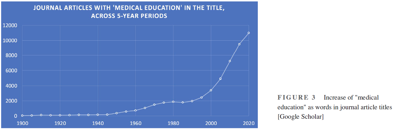 1980년에는 의학 교육 저널(현재의 학술 의학 저널), 영국 의학 교육 저널(현재의 의학 교육 저널), 그리고 의학 교사(Medical Teacher)의 세 개의 의학 교육 전문 저널이 있었다. 가장 오래된 것(의학교육저널)에는 1980년 한 해 동안(12호)에 걸쳐 450여 명의 저자가 등장했는데, 여기에는 비연구자뿐 아니라 두 번 이상 출판한 작가도 포함됐다. 2020년에, 이 저널의 12개 호에 기고하는 추정 저자의 수는 약 3배가 되었다. 2018년에 제이슨이 제시한 그래프와 비교할 수 있는 다른 성장 대용치가 그림 3에 나와 있다. 저널 기사 제목에 있는 "의료"와 "교육"이라는 단어의 조합은 50년 이내에 10배 증가를 보여준다. 게다가, 그 40년 동안, 국제 의학교육 저널의 수는 (해부학, 생리학, 생화학, 수술, 시뮬레이션, 그리고 많은 국가에서 의학 교육을 위한 국가 협회의 저널과 같은 전문 분야의 전용 교육 저널을 제외하고도) 3개에서 약 35개로 꾸준히 증가하였다