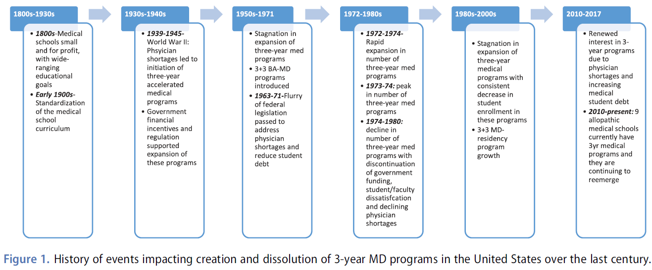 미국의 의학 교육 역사를 통틀어 3년제 MD 프로그램(제2차 세계 대전, 1970년대, 현재)의 시행과 관심의 물결이 세 차례 있었다. 성장기마다 나타나는 공통적인 요인에는 [의사 부족 문제를 해결]에 대한 우려가 포함된다. 역사적으로, 의사 부족을 진정으로 해결하기 위해서는, 3년제 또는 4년제 의과대학의 [학년 당 학급 규모를 늘려야 한다]는 사실이 재발하고 있다. 가속화된 MD 커리큘럼의 성장에 박차를 가하는 다른 영향으로는 정부 자금과 1970년대 이후 의료 교육 비용 절감에 대한 관심이 있다. 위에서 언급한 바와 같이, 가속화된 의료 프로그램의 재정적 인센티브는 주로 학생들이 1년 일찍 직장에 들어갈 수 있는 능력에 있으며, 이는 여러 다른 교육 시점을 단축함으로써 효과적으로 달성될 수 있다. 3년 MD 프로그램 중단의 이유는 [의사 부족에 대한 우려가 감소하게 되면] 외부(정부/주) 자금 지원이 줄어드는 것과 가속화된 프로그램에 참여하는 [의대생과 교수진이 표출한 불만]이었다. 이러한 우려에도 불구하고 3년제 MD교육 수료생은 4년제 졸업생과 동등한 국가고시 성적을 거두고 있다.