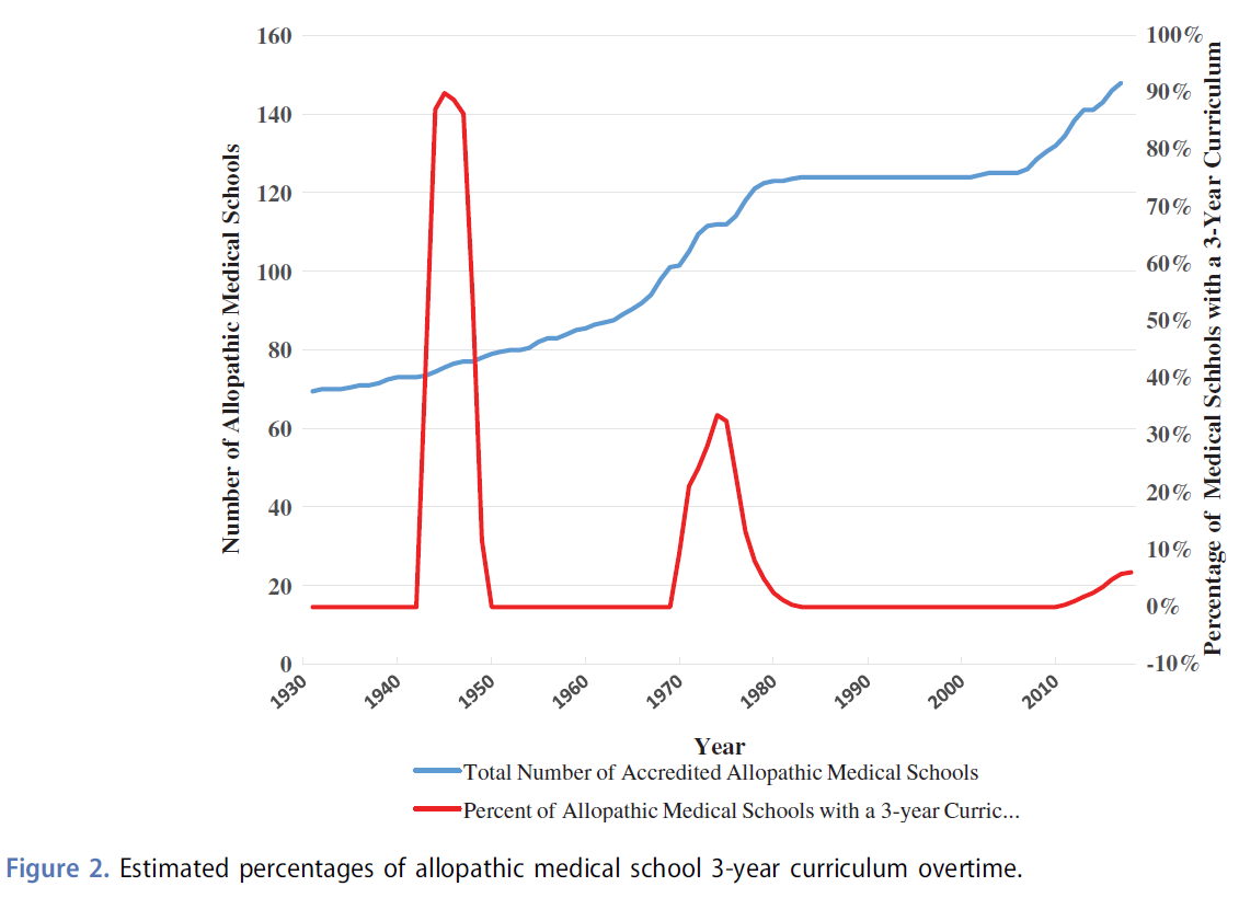 Figure 1 summarizes historical events impacting creation and dissolution of 3-year MD programs in the United States over the last century. Figure 2 documents the rise in total medical students from 1930 to 2017 juxtaposed against percentages of accredited allopathic medical schools with 3-year curriculum over the same period [9,12,20,22–38]. As can be seen in Figure 2, the greatest percentage of medical schools with a 3-year program occurred in the WWII era (≈90%) followed by the 1970s (≈40%). The most recent resurgence of medical schools with 3-year curricula is far less pronounced compared to spikes in the 1940s and 1970s.