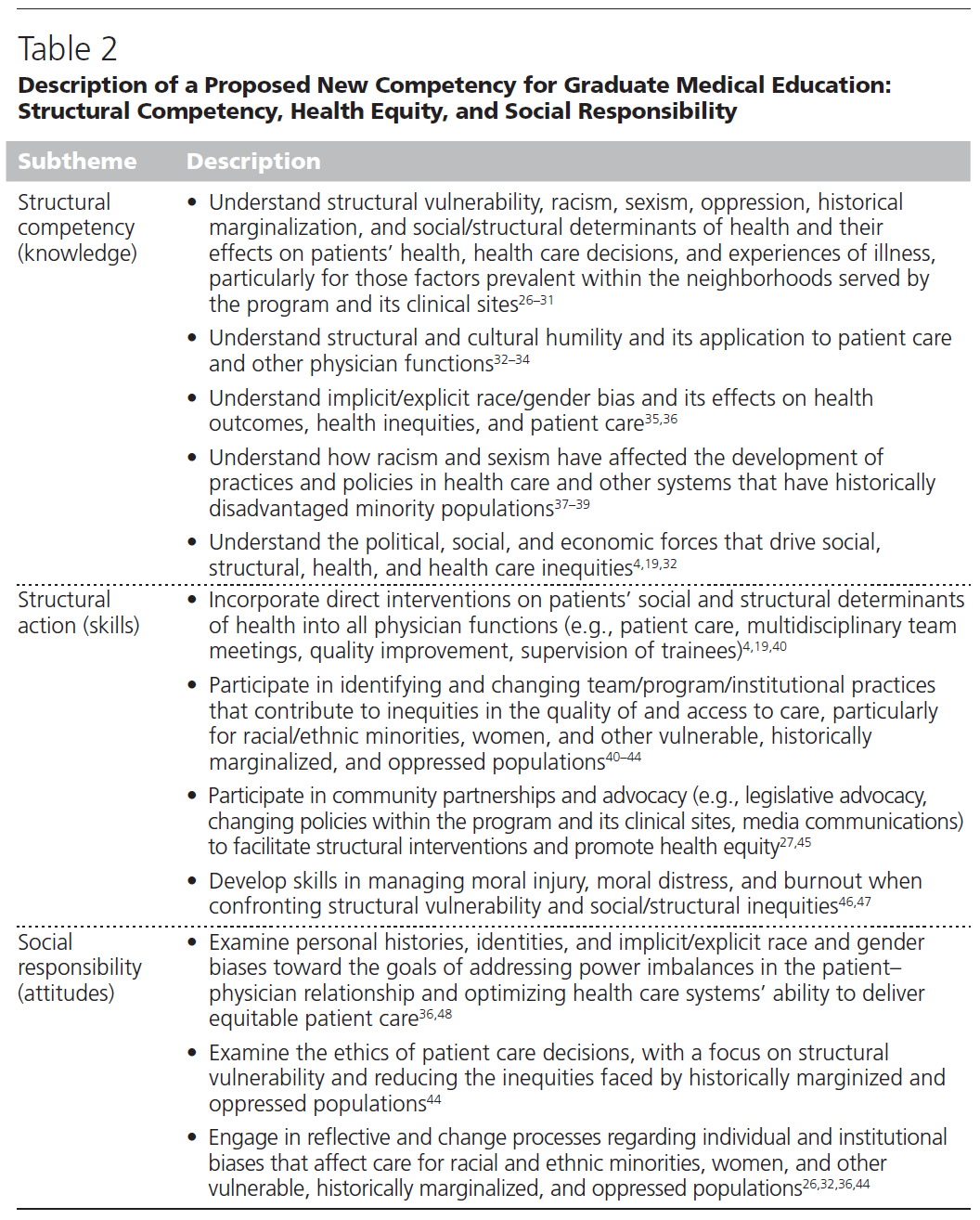 여기서는 구조적 역량(지식), 구조적 행동(기술), 사회적 책임(태도)의 세 가지 하위 주제로 대학원 의료 교육에 대한 새로운 역량을 제시한다(표 2 참조). [정책 구조]와 [의료 시스템]은 [공정한equitable 의료]를 제공하는 의사의 능력을 제한할 수 있다. 건강 형평성의 과정과 목표에 대한 헌신은 [건강 악화의 가장 큰 위험에 처한 사람들의 요구]를 우선하는 것을 수반한다.25 이러한 역량은 의사에게 [지역사회와 협력하고, 건강 및 사회적 불평등을 유발하는 제도 구조를 변화시키는 데 필요한 창의성]의 훈련을 장려할 것이다. 이러한 창의성은 다음 하위 역량에 기초할 것이다.