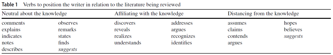 이처럼, 이렇게 간단한 요약 문장에도 [비판적 요약]의 풍미가 담겨 있다. 이것은 흠이 아니다. 오히려, 연구자가 자신과 논문을 포지셔닝 하게끔 [기존의 지식을 대화로 그려내는portraying 중요한 방법]이다. 하지만 그것은 의식적이고 전략적으로 이루어져야 합니다. 표 1은 작가들이 자신의 문헌에서 검토한 동사들이 그 분야의 기존 지식과 관련하여 어떻게 위치를 잡을 수 있는지를 생각할 수 있도록 예시를 제시한다. 의미는 문맥에 따라 달라지기에, 이러한 예는 지침으로만 채택되어야 한다. 예를 들어, 'suggests'은 중립적인 것 또는 거리를 두는 것으로 사용될 수 있다.