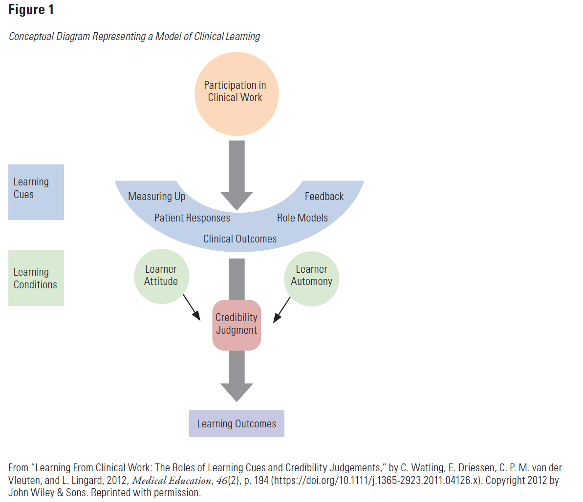 The process of clinical learning was represented using a diagram (Watling et al., 2012). Since the authors intended to evidence each key element of the model, they made the explicit decision to include the diagram at the beginning of the results section. By doing so, the diagram helped orient readers to what was to come and to how each element was connected.