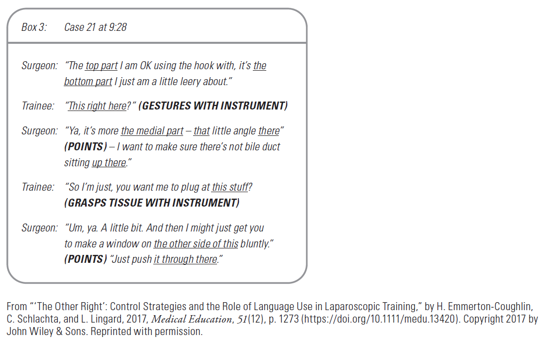 Correct implementation of the surgeon’s instruction relies on the trainee’s correct interpretation of the deictic expressions: “the top part” and “the bottom part”. The trainee responds, again using deixis, “This right here?” and pairs with it a physical localising manoeuvre in order to confirm her interpretation of the instruction given. The surgeon ratifies and then goes on to further refine the instruction with additional information and additional deictic instruction, adding his own physical gesturing manoeuvre. This back and forth highlights a concession by the trainee of a tight degree of control to the instructor during this high-stakes moment involving the identification and protection of a key structure, the bile duct.