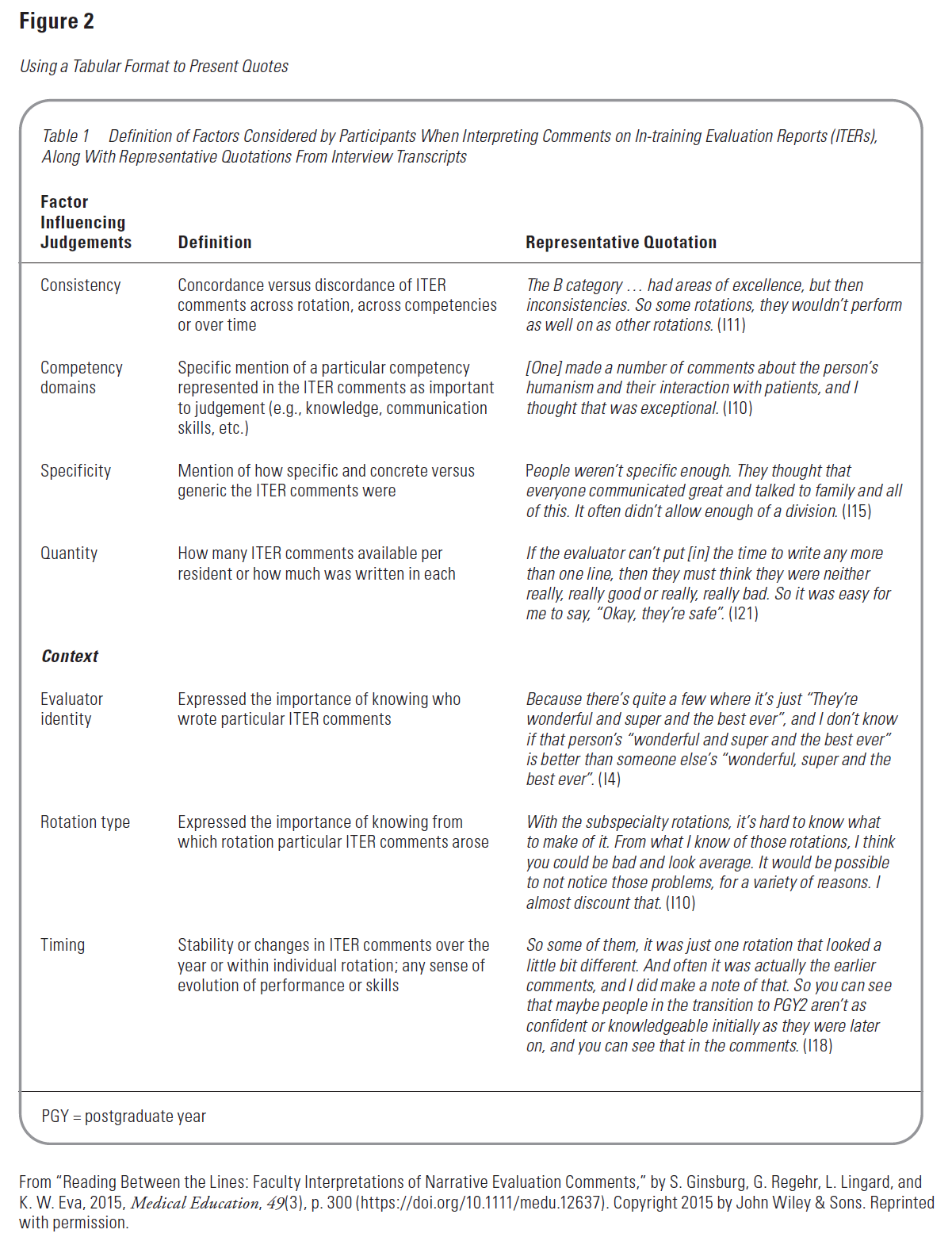 Another strategy for succinctness is to put the quotes into a table. While qualitative researchers may chafe at the constraints (and positivist roots) of the table format, it can be used strategically to present complex results at a glance. In this example, Ginsburg et al. (2015) name, define and illustrate the factors their participants considered when interpreting comments on in-training evaluation reports (see Figure 2).
