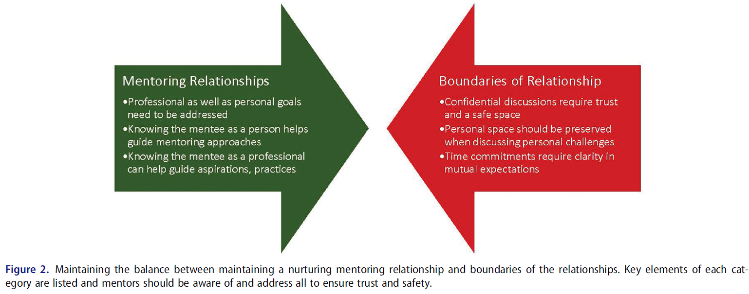 멘티와의 관계에 대한 투자가 필수적인 것으로 보고되었지만, 일부 멘토들은 이러한 관계에서 경계를 유지하는 것의 중요성을 강조했다. [경계]는 모든 전문적 관계에서 개인 간의 적절한 행동과 상호작용을 가이드하는 '기초적인 그라운드 룰'으로 설명되었다. 잭슨 등은 이전에 교차 성별 멘토링 관계에서 경계 유지의 중요성을 제기해 왔다(Jackson et al. 우리의 멘토들은 젠더 문제를 우려로 제기하지는 않았지만, 개인의 공간을 침해하지 않고 비밀을 유지하는 등 시간 약속에 대한 명확한 기대감에 대해 구체적으로 논의했다. 균형에 대한 필요성은 그림 2에 설명되어 있습니다.