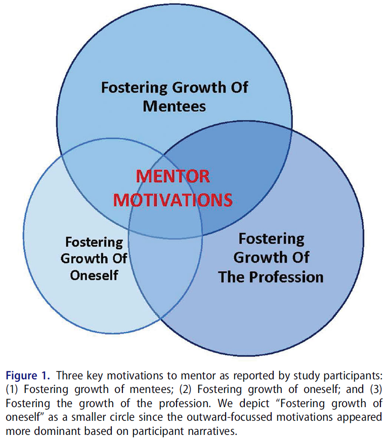 Our participants emphasised three key factors that motivated their participation in mentoring initiatives: growth of the mentee; growth of the field of health professions education, and growth of oneself, but emphasised the first two as altruistic and more dominant motivations. Mentor training could focus on nurturing, facilitating and coaching skills rather than general ‘how-to mentor’ skills, emphasise approaches to establishing psychological safety, and train mentors in encouraging mentees to take ownership of their professional development. Institutional and organisational mentoring initiatives can promote stronger and more impactful mentoring relationships by finding ways in which to identify mentors who are passionate about strengthening the field through altruistic motivations – for example through reflective narratives and critical conversations. Institutions should also ensure a safe and just learning and organisational culture that satisfy empathy altruism principles, such as normalising strengths and weaknesses top-down and overt expression of genuine concern for and joy at the well-being of others.
