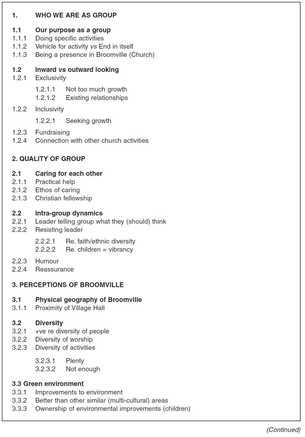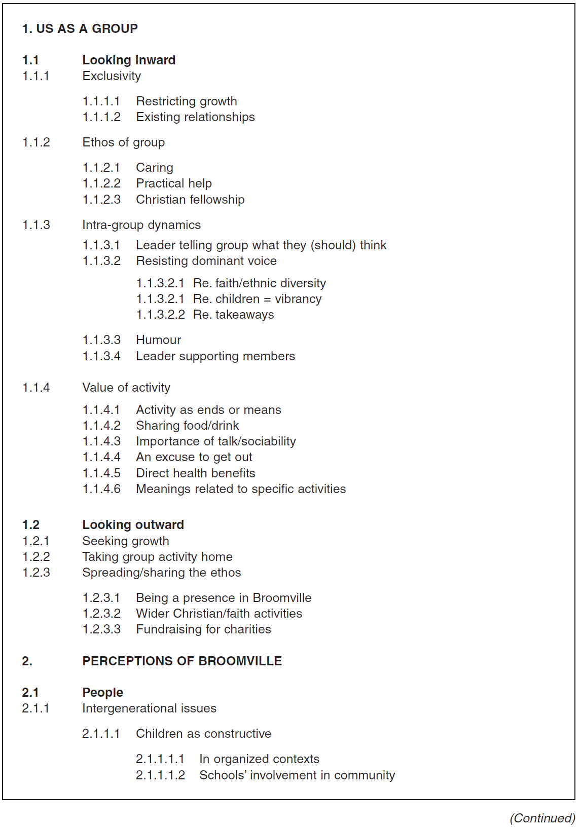 The previous example involved a change in the higher order classification as well as a change in the scope for the themes, since Ethos of Group moved into the second-level theme Looking Inward. This created a potential difficulty in that aspects of ethos that concerned how groups related to the world beyond them could have been neglected. We addressed this by constructing a thirdlevel theme under Looking Outwards entitled Spreading/Sharing the Ethos.