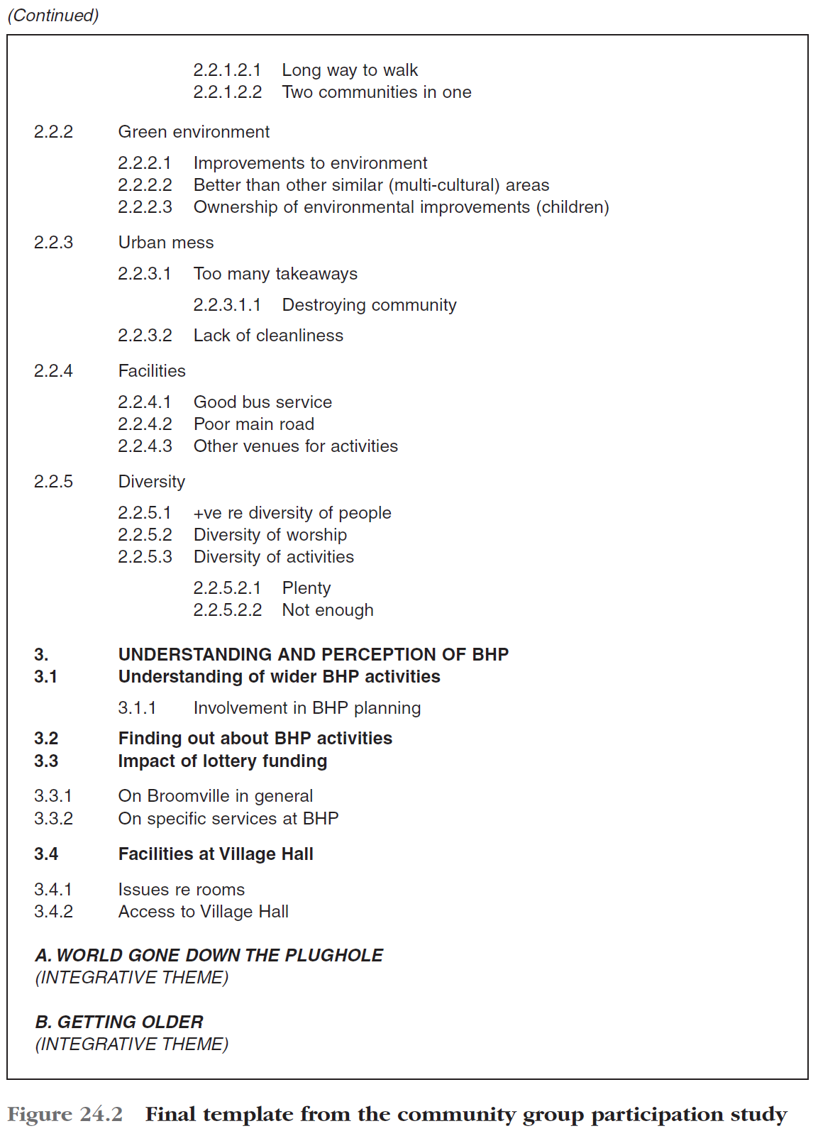 We then applied this revised initial template to the remaining two focus groups, noting where relevant material in these could not be readily covered by any theme on the template and where necessary revising the template accordingly. Finally we read through the individual interview transcripts to identify any further revisions needed. This resulted in the final version of the template shown in Figure 24.2.