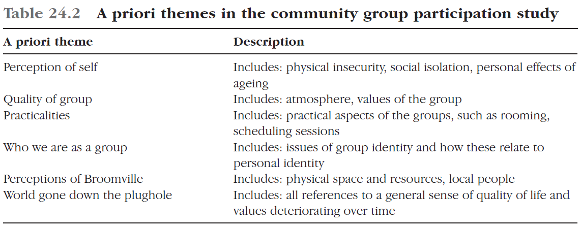 Template analysis can be positioned in the middle ground between top down and bottom up styles of analysis. It allows the researcher to define some themes in advance (a priori themes), but usually only a limited number that correspond to key concepts or perspectives for the study. It also insists that these are used tentatively, with the possibility always considered that any a priori theme may need to be redefined or discarded.