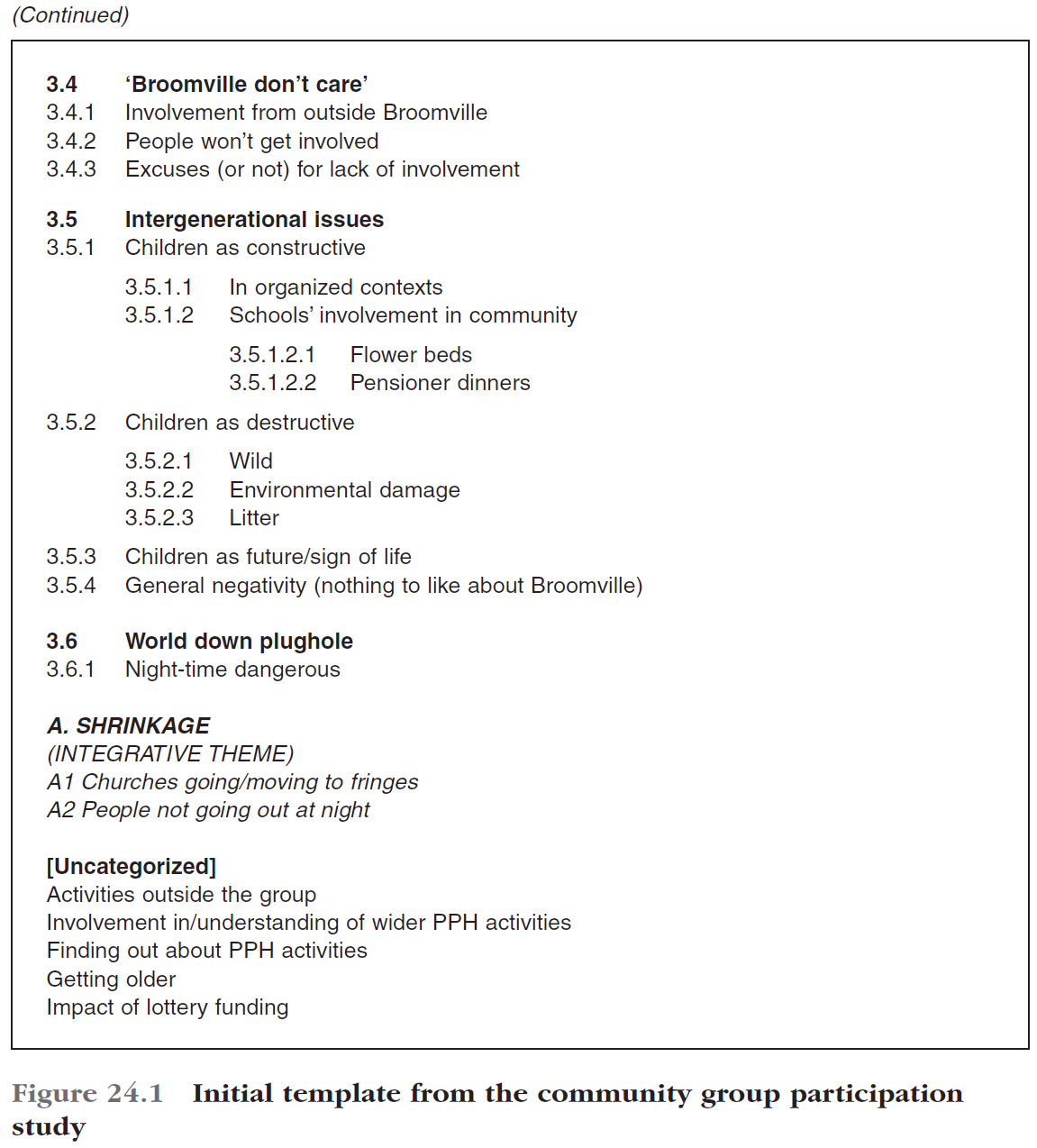그런 다음 이 수정된 초기 템플릿을 나머지 두 포커스 그룹에 적용하여 이러한 관련 재료가 템플릿의 어떤 테마에서도 쉽게 다뤄질 수 없는 경우와 그에 따라 템플릿을 수정해야 하는 경우에 주목했다. 마지막으로 개별 인터뷰 대본을 모두 읽고 추가 수정 사항이 있는지 확인합니다. 그 결과, 템플릿의 최종 버전이 그림 24.2에 제시되었습니다.