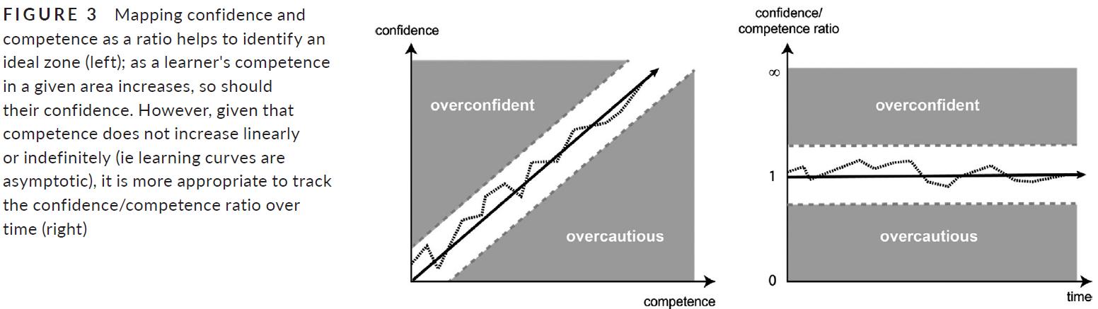 자신감은 [독립적인 변수나 구성으로서 측정하기보다는] 역량과 연결되어 있다고 생각할 수 있다. HPE에 대한 자신감과 역량의 상호작용은 오랫동안 고려되어 왔으며, 개인은 자신감과 역량이 분리될 때 문제가 있다고 본다. 역량과 자신감은 독립적으로 평가하기 어렵지만, 비율로 더 추적하기 쉬울 수 있다. 이는 주어진 기술에 대한 역량 점수에 대한 자신감의 비율(리커트 척도를 사용하여 평가)로 계산할 수 있다. 대안적으로, 교육자들은 자신감 앵커를 역량 앵커에 매핑하여 역량 단계를 통한 진행을 반영할 수 있습니다. 이상적으로는 자신감이 역량에 부합되어야 하며, 능력 있는 사람일수록 자신감이 있어야 하며, 그 반대의 경우도 마찬가지입니다(그림 3, 표 1). 다만 CCR이 잘못 보정됐을 때 문제가 발생할 수 있다.