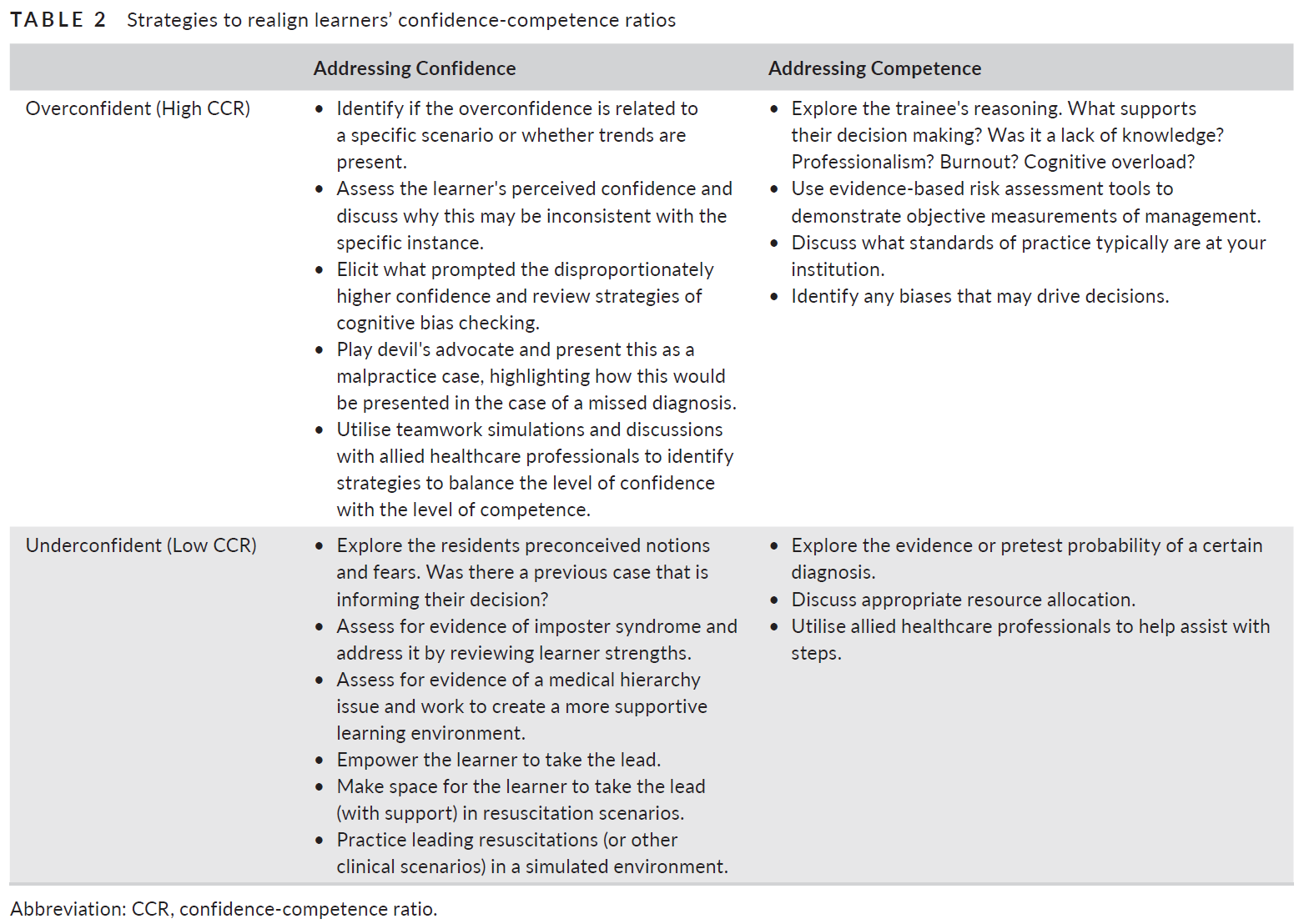 Both underconfidence and overconfidence may therefore benefit from targeted feedback and coaching efforts,5,66,67 with a goal of guiding learners to develop their own confidence-competence feedback loops. To that end, helping learners identify their successes and limitations with the support of specific incidences and performance data may be particularly valuable for linking confidence to their degree of competence.5,26,68-71 Table 2 sets out some strategies that could be employed to help realign learners’ CCR.