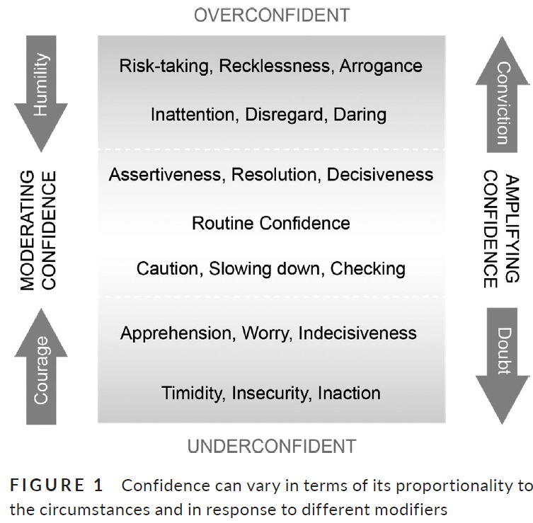 Confidence is dynamic (Figure 1). It can change rapidly in response to different modifiers, some of which can amplify confidence (eg, courage, conviction) while others moderate it (eg, doubt, humility). Moreover, the level of confidence should reflect the dynamics of the specific situation that an individual finds themselves in. Small variances in routine confidence are often warranted (eg, resolution in the face of an emergency or caution in the face of growing uncertainty), 11 whereas significant excesses or absences of confidence should be avoided (eg, timidity in the face of clarity, recklessness in the face of risk).6,26,34