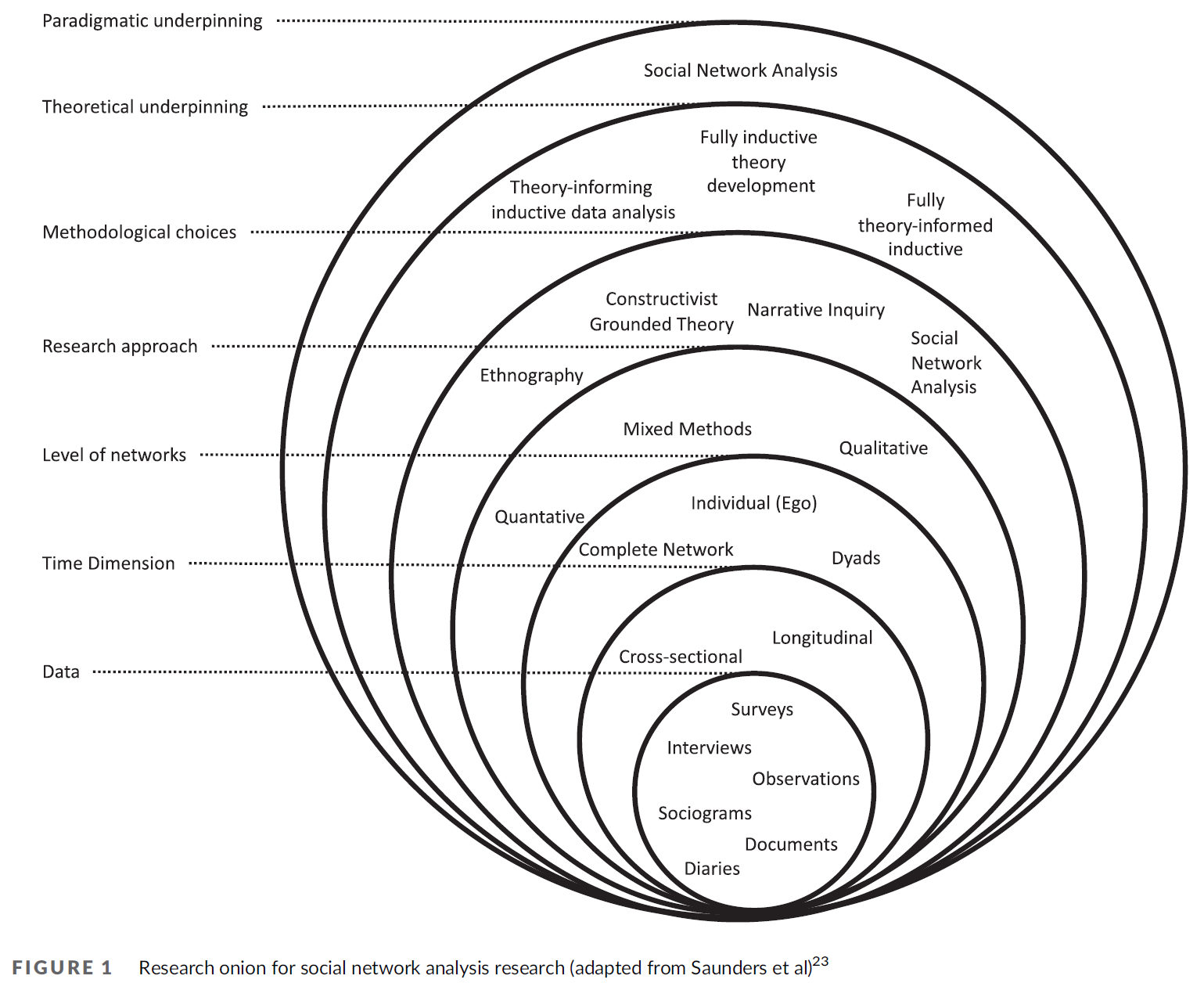 SNA는 이론적 및 방법론적으로 사용될 수 있는 패러다임이다. 복잡한 용도를 고려할 때, 연구자들은 연구 철학, 방법론적 선택, 데이터 수집 절차 사이의 정렬과 관련하여 많은 선택을 한다. 그림 1은 SNA 연구원이 SNA를 사용할 때 내릴 수 있는 결정을 설명하는 손더스 등의 인기 있는 연구 양파를 적용한 것이다.