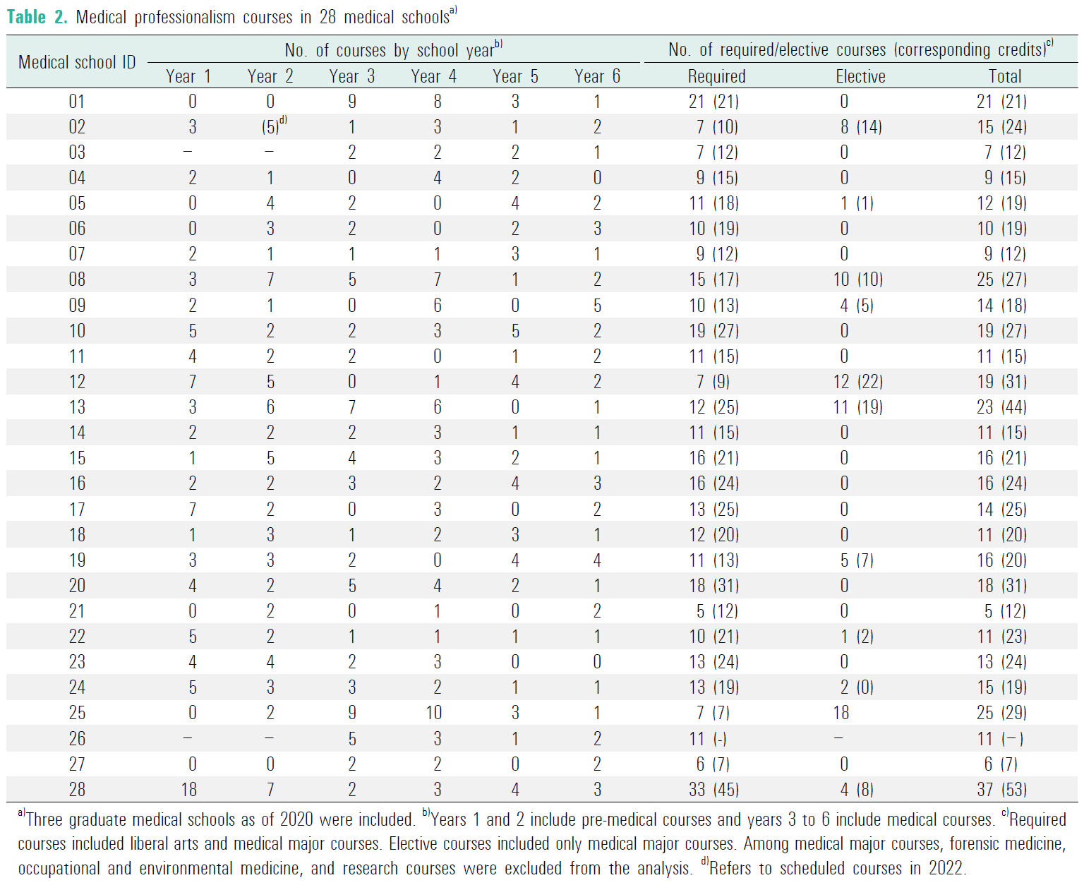 28개 의과대학에 개설된 전문직업성 관련 총 교과목 수는 최대37개에서 최소 5개까지 편차가 큰 것으로 나타났다. 16개(57.1%)대학은 모든 개설과목을 필수로 정하고 있었고, 12개(42.9%) 대학은 선택과목을 최소 1개에서 최대 18개까지 두었다. 필수과목 수도 최대 33개에서 최소 5개로 대학별 편차가 컸다. 전체 학년에 개설된필수과목 수가 20개 이상인 대학은 2개였고, 20개 미만에서 10개이상인 대학이 18개, 10개 미만인 대학이 8개였다. 대부분 대학은선택과목보다 필수과목의 비중이 컸지만, 일부 대학의 경우 필수과목보다 선택과목 수가 더 많거나(ID12, ID25) 선택과목 비중이 40%이상을 차지하는 대학(ID8, ID13)도 있어서 총 교과목 수가 많다고 해도 학생들이 이수하는 전문직업성 과목이 반드시 비례하는 것은아님을 알 수 있었다. 14개(50%) 대학은 의예과 1학년부터 의학과4학년까지 전 학년에 걸쳐 전문직업성 교과목이 연속적으로 개설되었던 반면 나머지 절반의 대학은 1개에서 3개 학년까지 전문직업성교과목이 개설되지 않았다(Table 2).