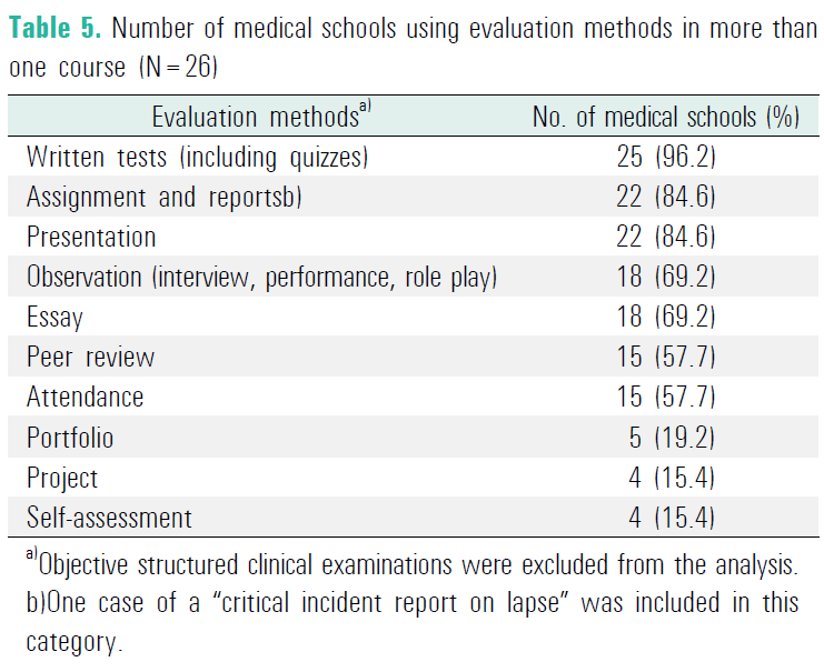 교과목별로 26개 대학의 응답자가 직접 기술한 평가방법 내용을분석하였다. 자료수집 시에 연구자는 예시로 지필시험, 자기평가,성찰적 글쓰기, 관찰평가, 동료평가, 중요사건 보고서 등의 평가방법을 예시하였다. 결과를 보면 우리나라 의과대학은 10가지의 평가방법을 사용하는 것으로 나타났다(Table 5). 25개 대학이 최소 한 과목이상에서 ‘지필고사’를 사용하고 있었고, ‘과제 및 보고서,’ ‘토론발표’는 22개 대학에서 활용하고 있었다. 면담, 수행평가, 역할극을 포함한‘관찰평가’와 ‘에세이’를 사용하는 대학이 18개였다. ‘동료평가’와‘출석’은 각각 15개 대학에서 평가방법으로 사용하고 있었다. 그 밖에 포트폴리오 평가, 프로젝트 평가, 자기평가 방법이 조사되었다.