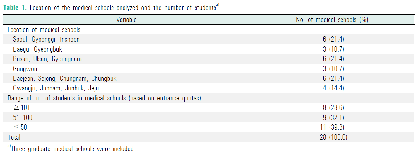 일부 항목에 대해 개방형 직접기술방식을 사용한 이유는 전문직업성 교육과정의 특수성과 복잡성 때문이었다. 기초의학 및 임상의학 교육과정과 달리 전문직업성 교육과정은 대학마다 교과목의 명칭이 너무 다르고 교과목별로 포함하는 교육내용의 범위도 매우 상이하다. 따라서 객관식 설문지 제작에 어려움이 있었고, 전문직업성의 개념과 정의조차 조사 응답자 간에 인식의 편차가 클 수 있어서 객관적이고 표준화된 설문조사방식보다는 개방형 자유기술 방식이 각 대학의 교육과정 현황을 있는 그대로 드러내고 응답결과의 타당성을 확보하기에 더 적합하다고 판단하였다. 자유기술 항목에 대해서는 연구자가 예시를 제시하여 응답자의 편의를 도모하였다. 자료수집기간은 2020년 1월 28일부터 2월 19일까지였다. 40개 조사대상 대학 중 28개(70%) 대학이 응답하였다. 분석대상 대학의 소재지와 학생 수는 Table 1과 같다.