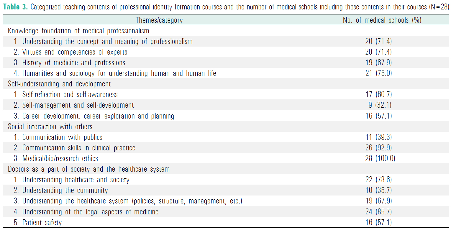 테마별로 보면, 약 25%–32%의 대학이 ‘전문직업성에 대한 지식 기반’을 다루지 않았고, ‘자기이해와 발달’에서는범주별로 39.3%–67.9%의 대학이 가르치지 않았으며, ‘타자와의 상호작용’에서는 ‘일반적 의사소통’과 ‘의료상황에서의 의사소통’을각각 60.7%와 7.1%의 대학이 다루지 않았다. ‘사회와 보건의료시스템 속의 의사’에서는 ‘환자안전’ 42.9%, ‘의료와 사회의 관계’ 21.4%의 대학이 교육내용에 포함하지 않았다.