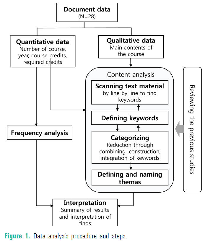 분석대상 자료는 문서형태였다. 자료의 내용은 서술식 내용과양적 수치로 구성되었기 때문에 분석방법은 자료 특성을 고려하여일반적인 질적 분석과 양적 분석을 병행하였다. 즉 전문직업성 교육과정 개설 교과목 수, 개설 학년, 학점 수, 필수․ 선택 여부와 같은양적 자료에 대해서는 빈도분석을 하였고, 교과목별 주요 교육내용은 내용분석의 방법을 활용하였다.