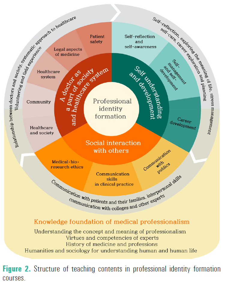 이런 관점에서 개인 영역에서 자기이해와 발달을 위한 자기성찰, 자기계발과 자기관리, 진로탐색 및 설계를 교육내용에 포함할 필요가 있다. 한편, 인간은 가족,친구, 동아리, 학교, 직장 등 특정 사회집단과 그 집단에서의 역할과 관련해서만 자신의 자아를 알 수 있다[5,38]. 그러므로 타자와 의사소통 역량을 증진시키는 과정은 전문직 정체성 형성과 밀접한 연관을 가지게 된다[39]. 일반인, 환자와 보호자, 동료와의 관계에서 의사소통과 윤리에 대한 주제가 정체성 형성 교육과정에 기본적으로포함되어야 한다[38,40]. 전체 사회와 보건의료시스템과의 관계에서 보면 의료와 정보기술의 발전, 의료에 대한 대중매체의 관심증가, 환자 돌봄에 대한 철학과 관리방식의 변화도 의사 전문직정체성의 변화에 중대한 영향을 미친다[41]. 의과대학에서 환자안전과 의료직종 간 교육이 강조되는 것은 이러한 맥락에서 중요하다. 타 직종 의료인과의 상호작용은 기존에 의사의 역할에 대해 갖고있던 생각과 타 의료직종 전문가의 역할을 비교하고 대조해 봄으로써 의사의 역할과 전문직 정체성에 이해를 밝혀줄 수 있다[42]. 최근연구들은 의사의 전문직 정체성에 대한 기술적 변화의 영향에 대해 개인수준의 전문직 정체성이 지속해서 변화하고 있음을 강조한다[43,44]. 그러므로 전문직 정체성 형성 교육과정에 사회적 맥락을이해하는 과정을 포함해야 한다.