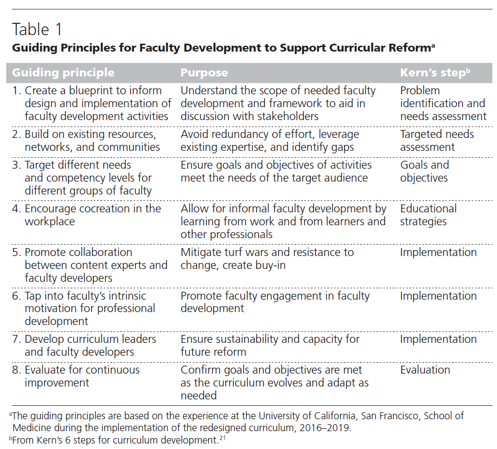 In 2016, the University of California, San Francisco (UCSF), School of Medicine rolled out a curriculum known as the Bridges Curriculum, which incorporates new educational approaches as well as new knowledge and skill domains. During the rollout of the curriculum and associated faculty development activities, we encountered challenges as well as factors that determined success. This experience informed the creation of guiding principles for faculty development to support curricular reform. I organize these principles according to Kern’s steps of curricular development, 21 with an emphasis on implementation (Table 1). For each principle, I provide examples from UCSF’s experience and references to relevant literature.