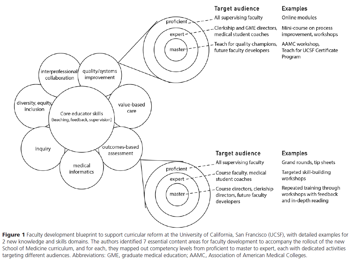 우리의 청사진은 새로운 커리큘럼에서 효과적인 교사와 감독이 되기 위해서는 서로 다른 교수진과 다른 기술들이 필요하다는 것을 깨닫는 데 도움이 되었습니다. 학습자와 교류하는 모든 교직원이 전반적인 교육목표에 대한 이해가 필요한 반면, 엄선된 교직원 그룹만이 깊이 있는 전문지식과 다양한 콘텐츠 영역 및 교육요소에 대한 이해를 필요로 했다. 이러한 접근 방식은 학습자를 접하는 모든 교수진이 핵심 교수 기술을 개발해야 하며, 교육에 더 큰 책임을 지는 교수진은 고급 교육을 추구해야 한다는 권고로 반향을 불러일으킨다. 따라서 AAMC Te4Q 프로그램을 본떠 다양한 역할을 가진 교수진에게 다양한 역량 수준이 요구되었습니다.