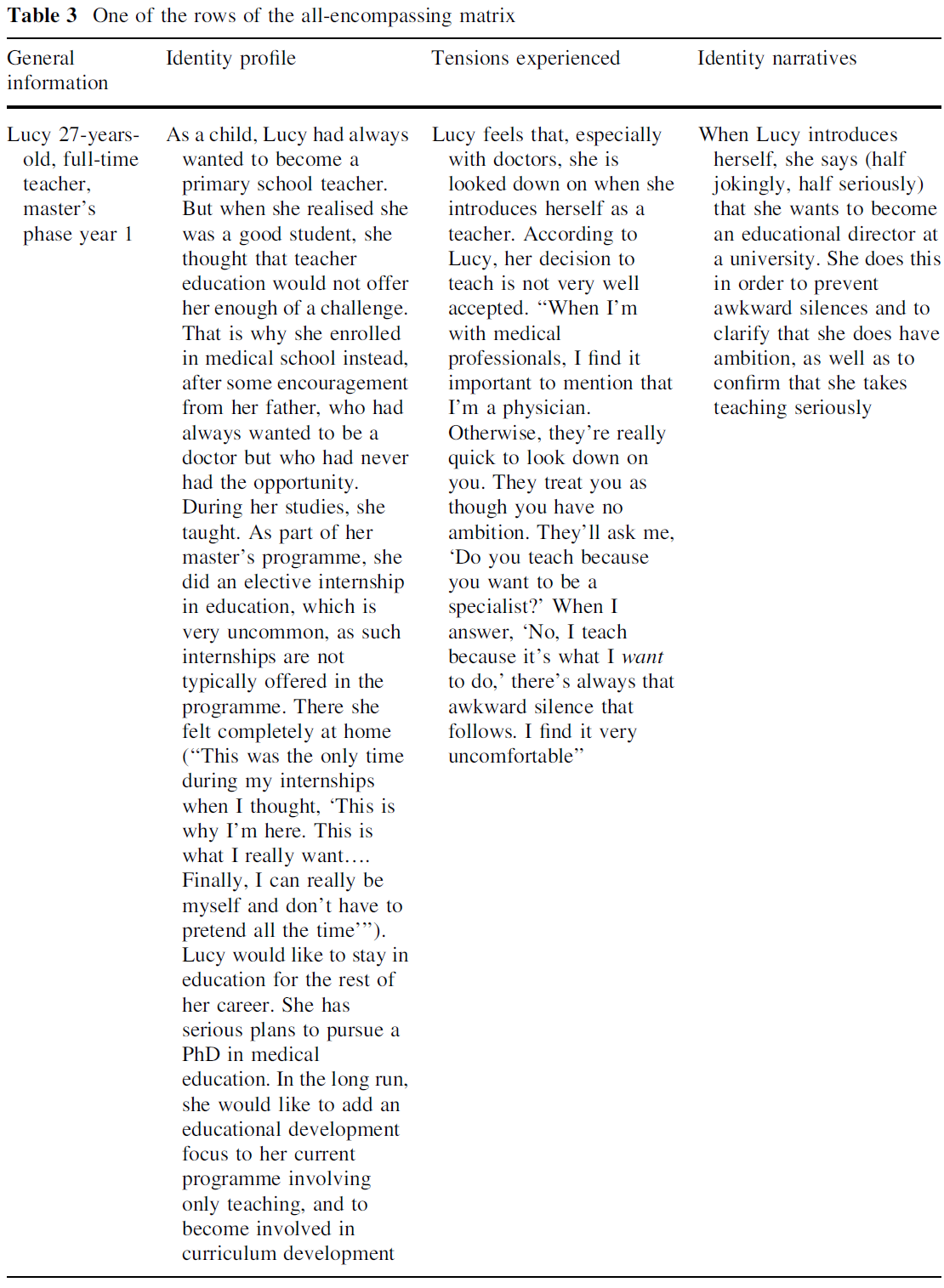Finally, four of the teachers adopted the identity narrative of questioning or trivialising the role of status altogether. In this fifth identity narrative, the teachers adopt a meta-position (Hermans and Hermans-Konopka 2010) by taking a certain distance from the collective stories within the figured world of research or health care. By adopting this meta-position, the teachers render ‘status’ less important, thereby making it easier to integrate the I-position of teacher into their identity. Will, for example, distances herself from people who think doctors are important, thereby putting the higher status of patient care and research into perspective: