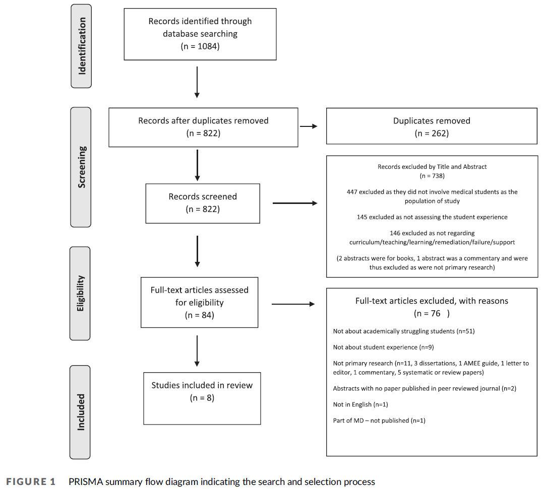 Identifying relevant research: Table 1 lists the terms used for searches of MEDLINE, EMBASE, PsycInfo, Web of Science, British Education Index and ERIC databases on 15/12/2019 and re-run on 27/08/2020. - 스터디 선택: 처음 두 저자는 박스 1에 요약된 세 가지 기준을 사용하여 독립적으로 기사를 심사했다. 첫 번째 기준(관심인구)의 활용은 제목심사에서 모든 학생에서 추상심사에서 의대생으로 점차 좁혀졌고, 최종적으로 전체 본문심사에서 학업적으로 어려움을 겪는 학생으로 확대되어 관련 논문이 조기에 간과되는 일이 없도록 하였다. 제목 검토 결과 484개 기사가 빠졌고, 추상심사에서는 200개 논문이 추가로 빠져 84개 논문이 전문심사 대상으로 남게 됐다. 검토 대상에 포함된 7개 논문에 대한 합의가 이뤄졌다. 제3저자는 합의가 이뤄지지 않은 논문 4편을 검토했다. 이 중 1건이 기준을 충족해 8건이 검토 대상에 포함됐다. 연구 품질은 혼합 방법 평가 도구를 사용하여 평가되었다. 검토자 DK와 GW 사이에 8개 연구 모두에 대한 합의가 있었다. 6개는 양질의 연구로 간주되었고, 54-59는 낮은 연구였다. 60, 61