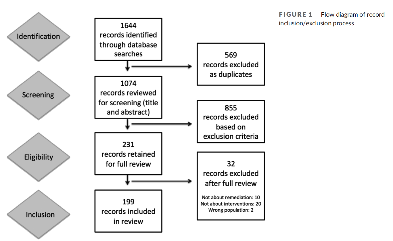 - records that mentioned specific remediation interventions or described theoretical approaches or viewpoints on interventions, whether they were the focus of the record or not.